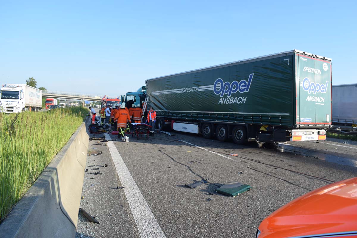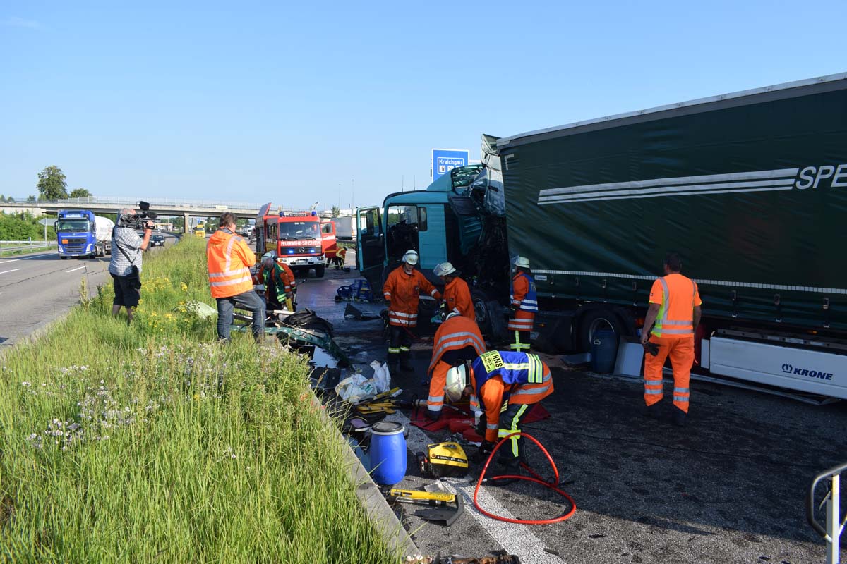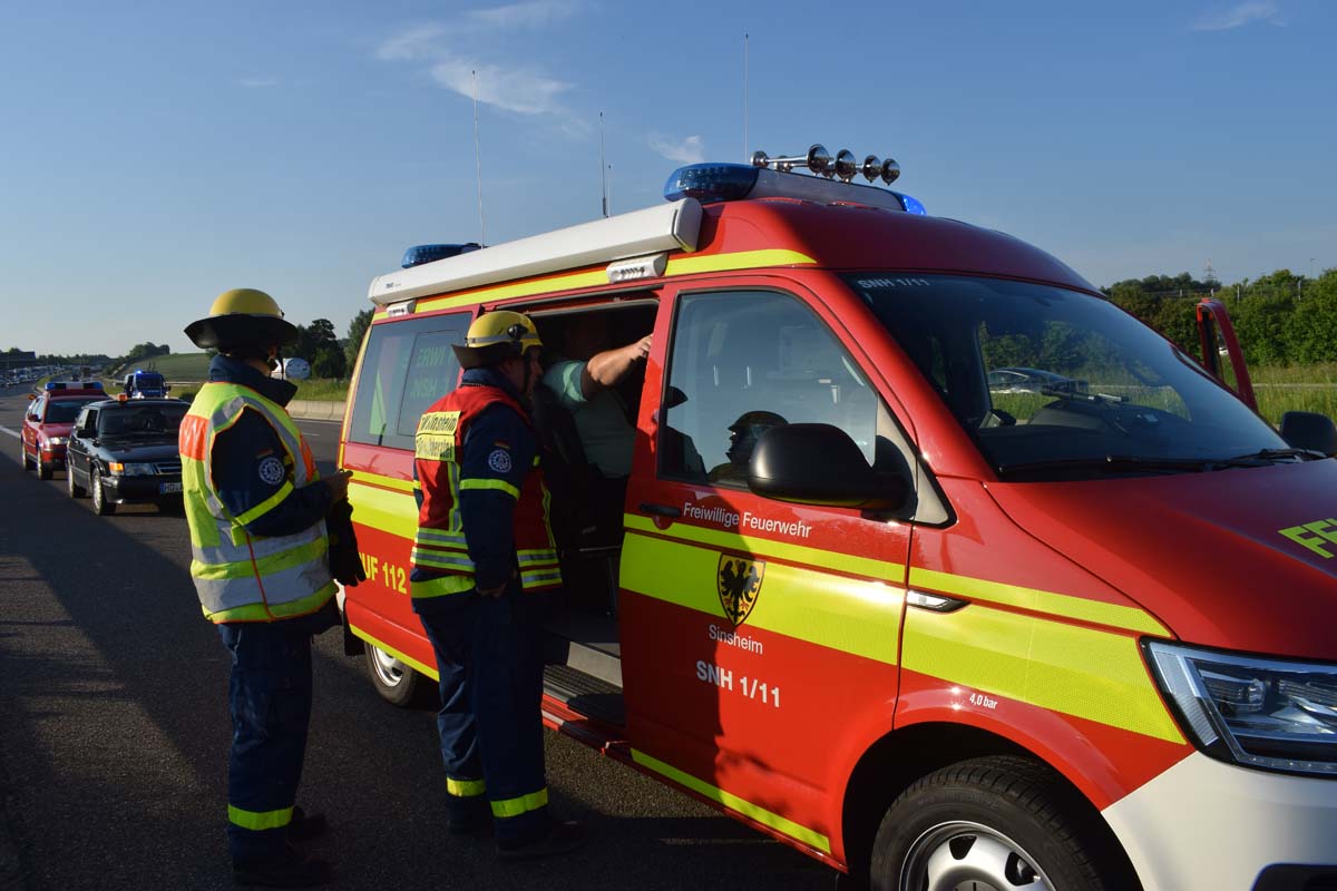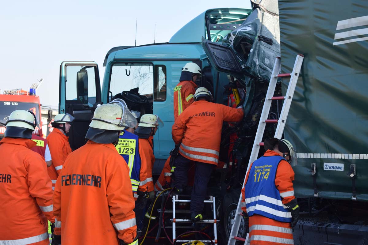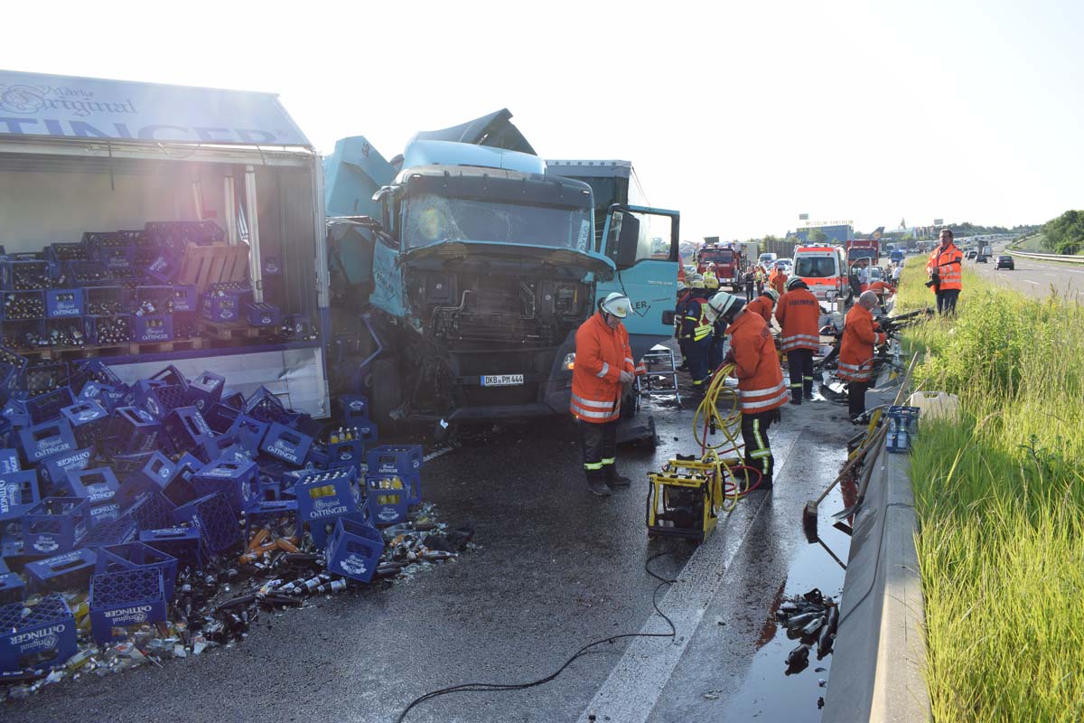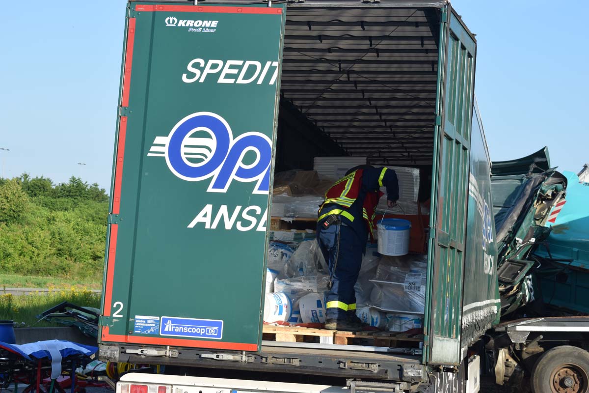 (zg) Ein schwerer LKW-Unfall ereignete sich am frühen Montagmorgen gegen 06.30 Uhr auf der A6 zwischen den Anschlussstellen Sinsheim-Steinsfurt und Sinsheim-Süd in Höhe des Stadions. Nach derzeitigem Stand musste der Fahrer eines Getränkelasters wegen einer Verkehrsstockung anhalten. Ein mit Müll beladener Hängerzug erkannte den Rückstau und bremste ebenfalls ab. Ein mit Farbe beladener LKW übersah jedoch, aus bislang ungeklärter Ursache den Rückstau und schob den Hängerzug auf den Getränkelaster. Bei dem Zusammenprall brach bei dem Hängerzug die Achse und die beiden mit Müll beladenen Container verkeilten sich auf der Fahrbahn. Das Führerhaus des Unfallverursachers wurde bei dem Aufprall bis auf wenige Zentimeter zusammengeschoben. Er musste von der Feuerwehr Sinsheim mit hydraulischem Rettungsgerät aus seinem bis auf ca. 40cm zusammengeschobenen Führerhaus gerettet werden. Nach einer notärztlichen Stabilisierung musste er mittels Rettungshubschrauber in eine Spezialklinik geflogen werden. Die verlorene Ladung und die ausgelaufenen Stoffen müssen nun vom THW umgeladen werden. Die Bergungsarbeiten werden bis in den Nachmittag andauern.