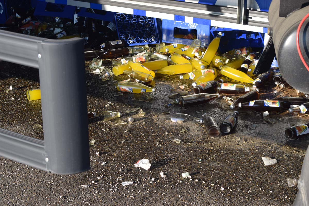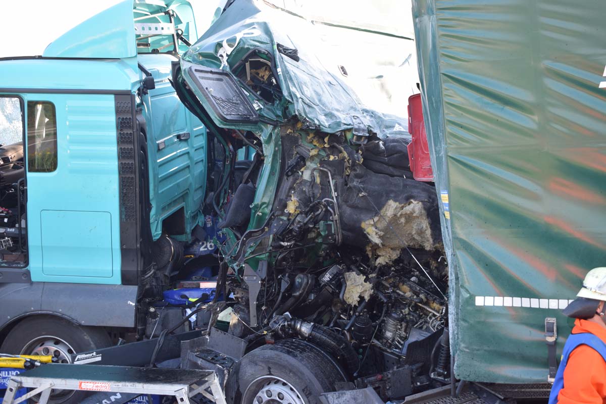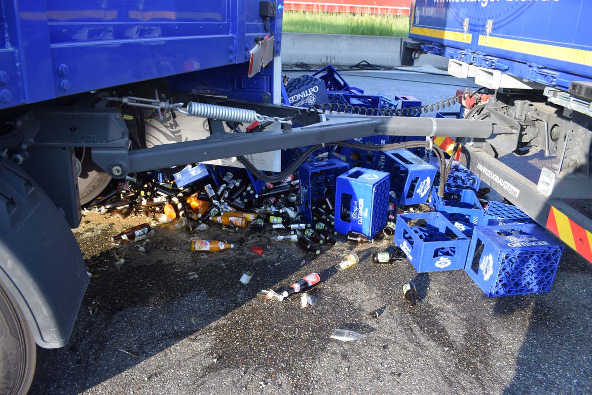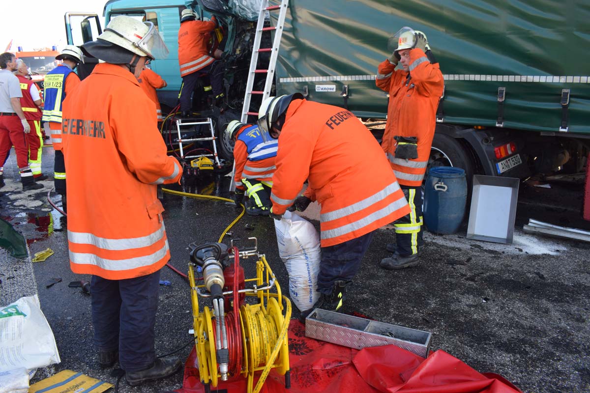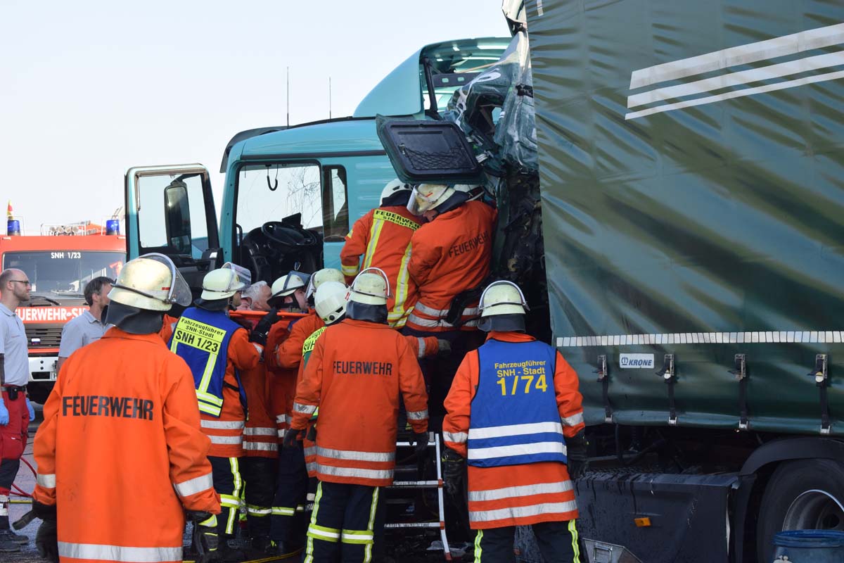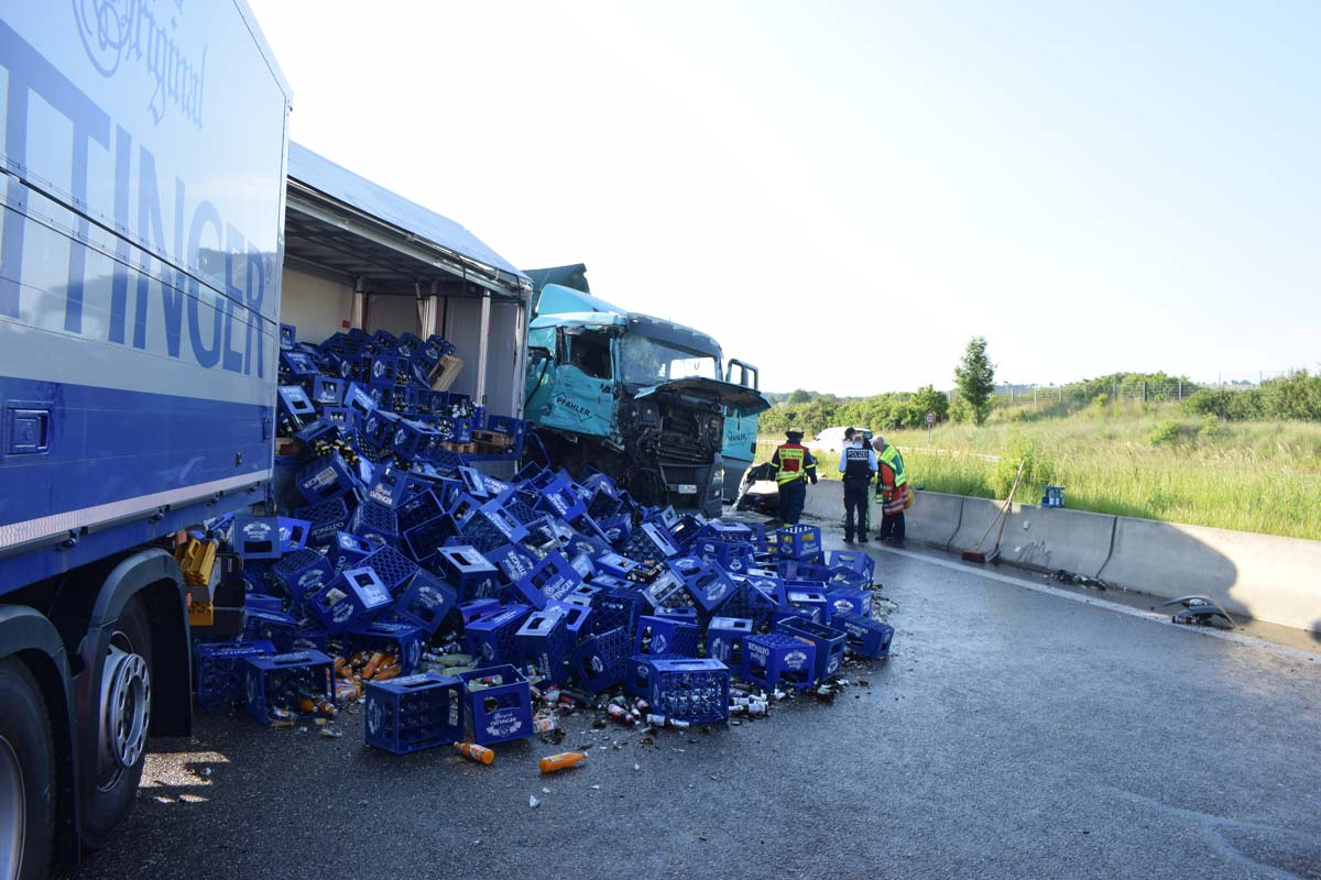 (zg) Ein schwerer LKW-Unfall ereignete sich am frühen Montagmorgen gegen 06.30 Uhr auf der A6 zwischen den Anschlussstellen Sinsheim-Steinsfurt und Sinsheim-Süd in Höhe des Stadions. Nach derzeitigem Stand musste der Fahrer eines Getränkelasters wegen einer Verkehrsstockung anhalten. Ein mit Müll beladener Hängerzug erkannte den Rückstau und bremste ebenfalls ab. Ein mit Farbe beladener LKW übersah jedoch, aus bislang ungeklärter Ursache den Rückstau und schob den Hängerzug auf den Getränkelaster. Bei dem Zusammenprall brach bei dem Hängerzug die Achse und die beiden mit Müll beladenen Container verkeilten sich auf der Fahrbahn. Das Führerhaus des Unfallverursachers wurde bei dem Aufprall bis auf wenige Zentimeter zusammengeschoben. Er musste von der Feuerwehr Sinsheim mit hydraulischem Rettungsgerät aus seinem bis auf ca. 40cm zusammengeschobenen Führerhaus gerettet werden. Nach einer notärztlichen Stabilisierung musste er mittels Rettungshubschrauber in eine Spezialklinik geflogen werden. Die verlorene Ladung und die ausgelaufenen Stoffen müssen nun vom THW umgeladen werden. Die Bergungsarbeiten werden bis in den Nachmittag andauern.
