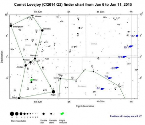C/2011 W3 (Lovejoy ist ein periodischer Komet, der Ende November 2011 von Terry Lovejoy in Australien entdeckt wurde. Auch die Besatzung der Internationalen Raumstation konnte ihn betrachten und filmen. Der Komet gehört zu der sogenannten Kreutz-Gruppe. Astronomen vermuteten, dass dieser Komet um den 16. Dezember 2011, also seinem Periheldurchgang, so hell sein würde, dass er sogar freiäugig hätte beobachtet werden können. Man nahm an, dass er mit großer Wahrscheinlichkeit dabei zerbrechen würde. Allerdings überstand der Komet die Annäherung auf 140.000 km