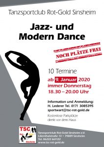 Der Tanzsportclub Rot-Gold Sinsheim, Lilienthalstr. 13 in Sinsheim, bietet ab dem 09.01.2020 einen Jazz und Modern Dance Kurs immer donnerstags von 18:30 bis 20:00 an. Es sind 10 Termine geplant und derzeit noch einige wenige Plätze frei.