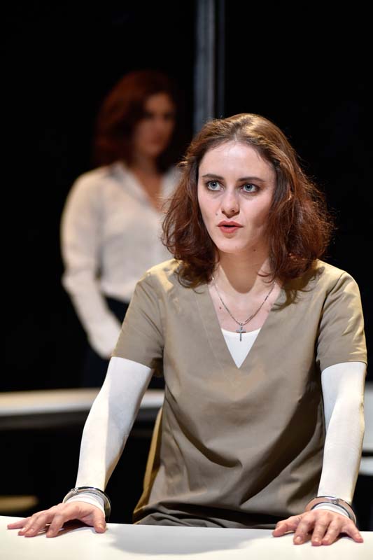 Glas ist das Material, das der Bühnenbildner Tommi Brem als bestimmendes für seine Bühne gewählt hat. Er orientiert sich an der zeitgenössischen Architektur von Macht- und Konzernzentralen, wo Glas größtmögliche Transparenz suggerieren soll. In Hinblick auf Schillers Text hat es die gleiche Funktion wie die dort immer wieder bemühte Rhetorik der Rechtstaatlichkeit. Beides täuscht darüber hinweg, dass letztendlich das Privatinteresse und die ungute Akkumulation von Macht in den Händen der Königin das politische Handeln undurchsichtig machen und in die Katastrophe münden lassen. Komplettiert wird der Raum durch die Musik von Paolo Greco. Eine sakrale Musik, die auf Vorbilder aus der Renaissance zurückgreift, somit eine Brücke schlägt zum historischen Ort des Geschehens und den religiösen Grundkonflikt präsent hält.