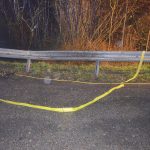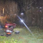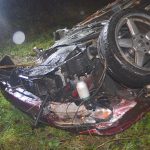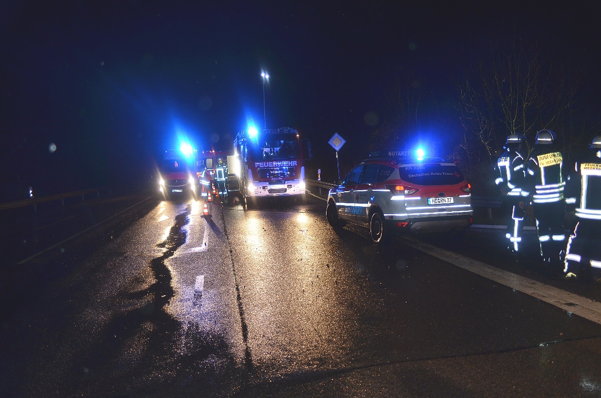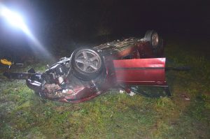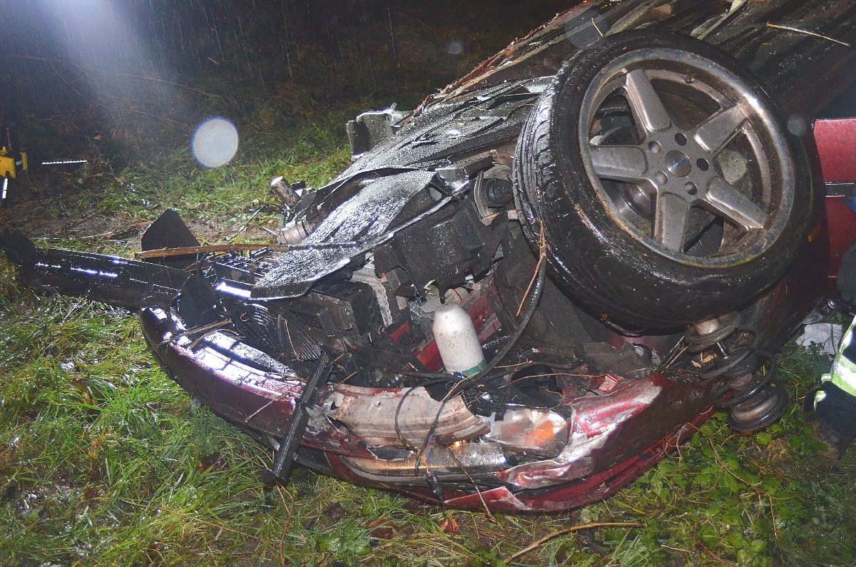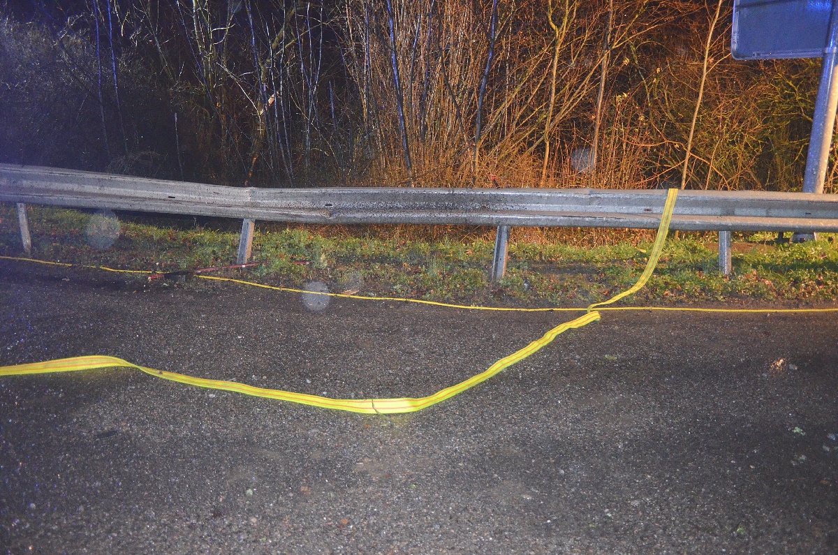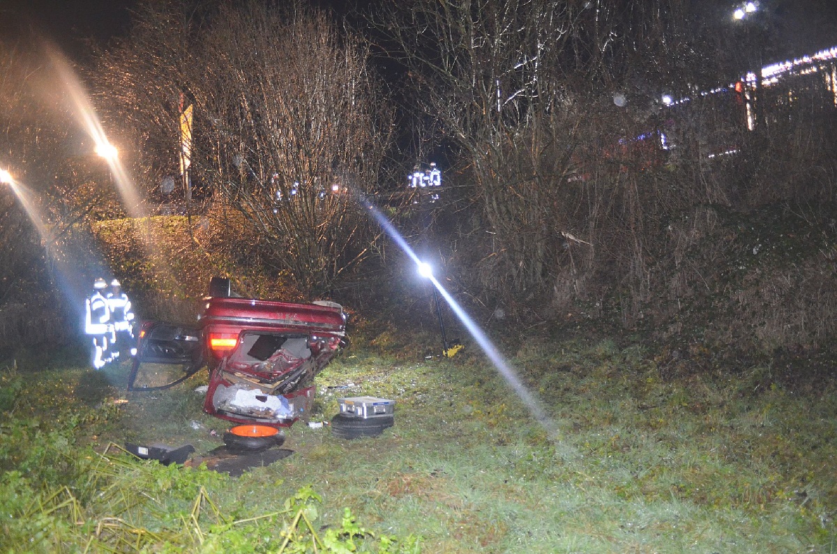 Meckesheim. (red) An der Abzweigung B45 zur L549 zwischen Zuzenhausen und Meckesheim hat sich am 04.01.2020 gegen 0:45 Uhr ein Verkehrsunfall ereignet. Der Lenker eines BMW kam auf nasser Straße von der Fahrbahn ab, fuhr über die an der Abzweigung befindliche Mittelinsel der L549 und gradewegs gegen die Schutzplanke. Diese gab durch den Aufprall teilweise nach und bog sich nach hinten wodurch sie zu einer Art Rampe wurde. Das Unfallfahrzeug hob daraufhin ab, flog durch die Baumkronen der dahinter, etwas tiefer stehenden Bäume und landete schließlich auf dem Dach liegend in einem noch tiefergelegeneren Acker. Das Dach des Fahrzeugs wurde beim Aufprall auf den Boden stark eingedrückt – der Wagen wurde völlig zerstört. Bereits an der Schutzplanke sowie beim Flug durch die Bäume rissen auf der Beifahrerseite das Vorder- und Hinterrad ab. Wie durch ein Wunder wurden die beiden Insassen nicht in ihrem Auto eingeklemmt. Zwei Rettungswagen verbrachten die Verletzten zur weiteren Untersuchung ins Krankenhaus. Die Feuerwehr Meckesheim war mit vier Fahrzeugen vor Ort um den Brandschutz sicherzustellen und die Unfallstelle auszuleuchten. Ermittlungen zur Unfallursache durch die Polizei dauern derzeit noch an.