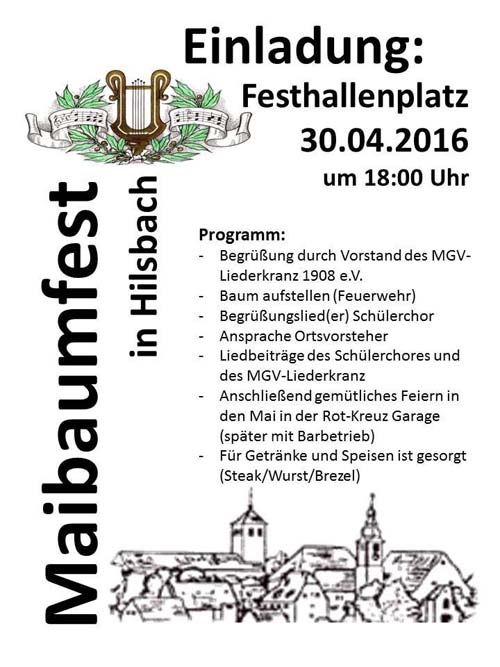 Am 30.04.2016 findet wieder das alljährliche Maibaumfest statt. Dieses Jahr ist der MGV Liederkranz 1908 Hilsbach e.V. der Veranstalter. Beginn ist um 18:00 Uhr auf dem Festplatz vor der Mehrzweckhalle. Nach dem Maibaumstellen gibt es in DRK-Garage Steaks, Würste, Brezeln und Getränke sowie eine Bar mit diversen Getränken.