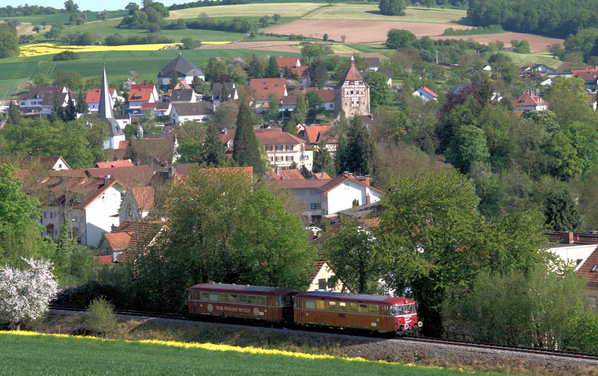 (zg) „Gemeinsam Denkmale erhalten“ heißt das Motto des diesjährigen „Tag des offenen Denkmals“ am kommenden Sonntag, 11.09.2016. Ganz einfach geht das mit einer Mitfahrt in einem historischen Zug zum normalen Nahverkehrstarif. Der Krebsbachtäler ROTE FLITZER, eine historische Schienenbusgarnitur aus den 1950er und 1960er Jahren, erinnert an die spannende Epoche des Wirtschaftwunders. Schnell lässt man sich von der Aufbruchsstimmung jener Zeit anstecken und steckt mitten in einem unvergesslichen Bahnerlebnis. Die Fahrgäste lernen die weitgehend noch in ihrem Ursprungszustand erhaltene Nebenstrecke Neckarbischofsheim Nord – Hüffenhardt aus der ungewohnten Perspektive des Lokführers kennen, dem man während der Fahrt „über die Schulter“ schauen kann. Oder man lehnt sich entspannt zurück und genießt den konkurrenzlosen Panoramablick, den der rundum verglaste ROTE FLITZER bietet. Das ist dank umklappbarer Rückenlehnen immer in Fahrtrichtung möglich.