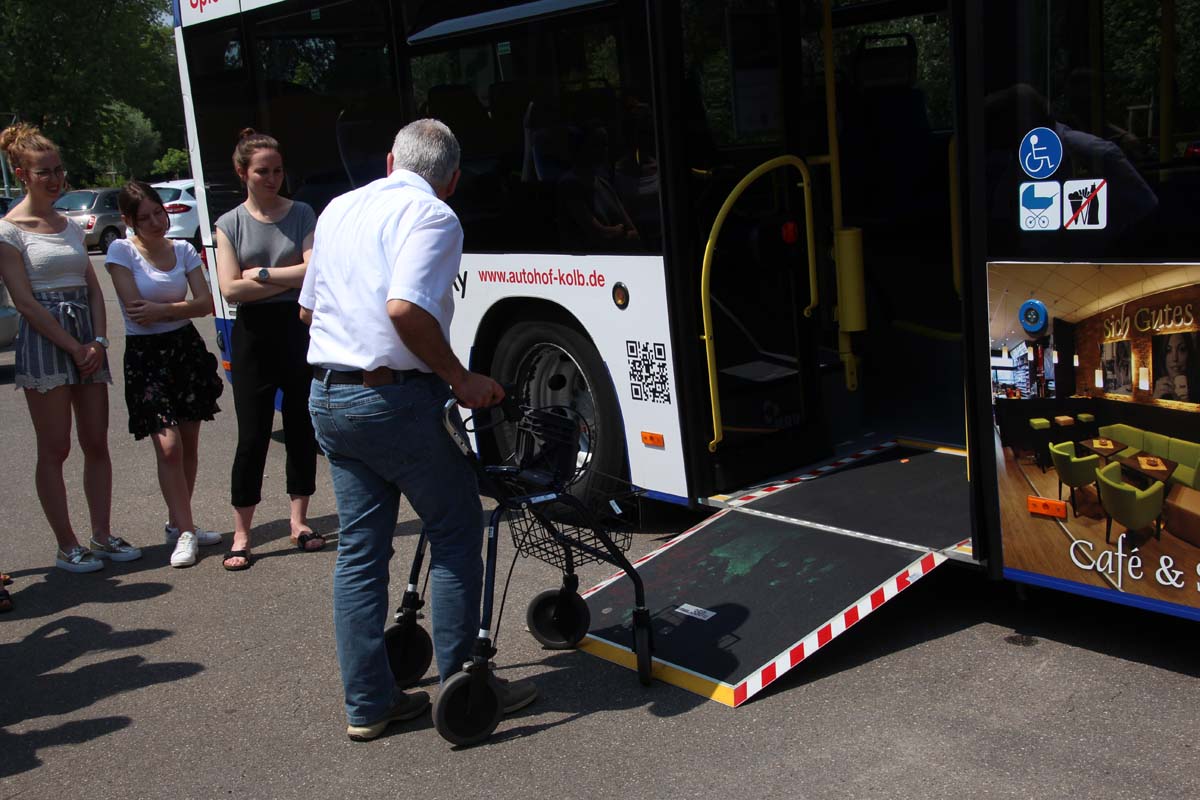 (cr) Eine richtig tolle Aktion veranstaltete der Pflegestützpunkt Rhein-Neckar-Kreis gemeinsam mit der Verkehrswacht Kraichgau e.V. und der Stadt Sinsheim in der Elsenzhalle Sinsheim.  Nach einem Infofilm und einer Stärkung mit Kaffee und Kuchen konnten die 20 Senioren unter fachmännischer Anleitung einem Parcour widmen. Auch das richtige ein- und aussteigen von einem Bus konnte geübt werden. Ich gebe zu vieles davon hätte ich selbst falsch gemacht. Auch OB Jörg Albrecht übte sich im Parcour, so ist er dann für die späteren Amtszeiten schon bestens gerüstet. Gabi Stegmaier vom Tanzcentrum Sinsheim zeigte den Senioren wie man auch mit einem Rollator noch eine kesse Sohle aufs Parkett legen kann.