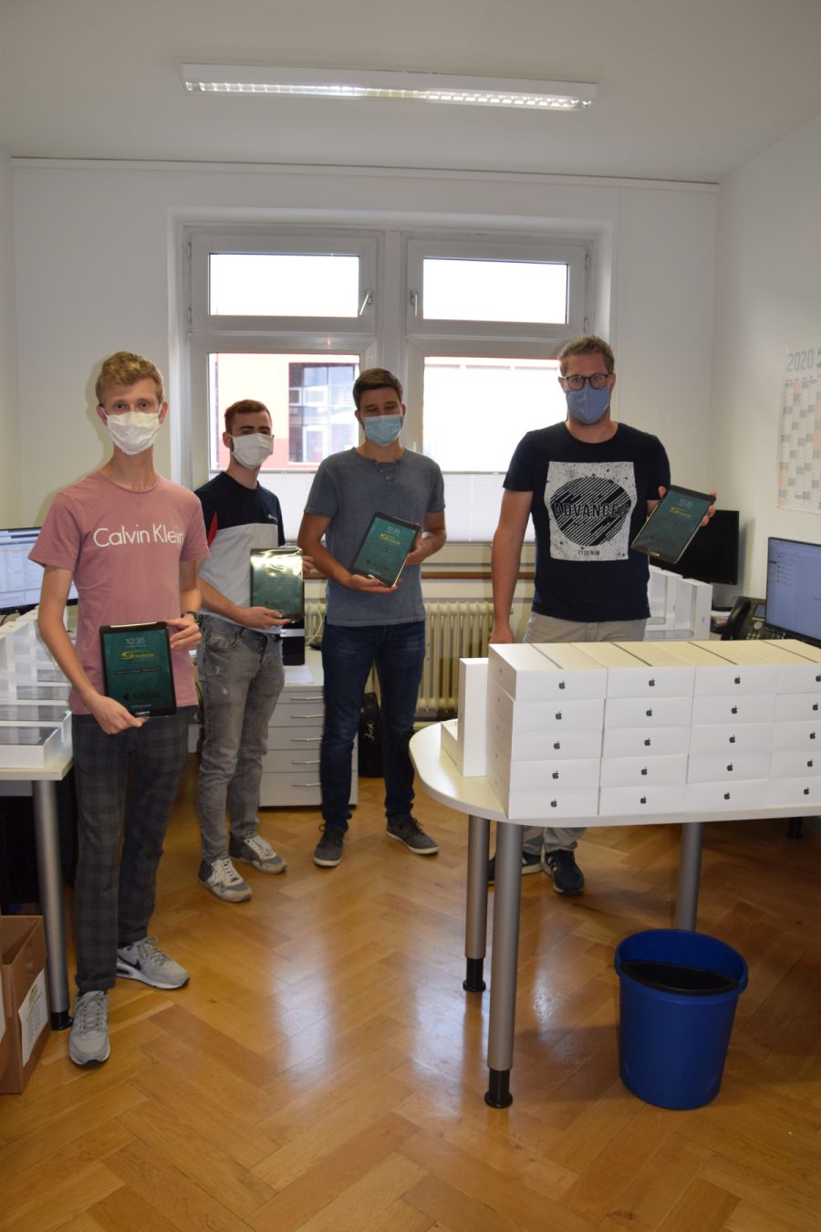 Derzeit werden die Geräte im Amt für Informations- und Kommunikationstechnik der Stadt Sinsheim eingerichtet. Die iPads sind bereits eigetroffen und werden augenblicklich konfiguriert. Neben den Standardanwendungen, die sich auf den Geräten aller Sinsheimer Schulen finden, werden auf Wunsch der jeweiligen Einrichtung individuell benötigte Apps installiert. In den Büros und auf den Schreibtischen stapeln sich die Kartons. Amtsleiter Wolfgang Wagner spricht von einem „erheblichen Arbeitsaufwand“, der in das Sofortausstattungsprogramm fließt. Zwei Mitarbeiter und zwei Auszubildende sind allein zwei Wochen mit der Einrichtung der iPads beschäftigt. Die Lieferung der Notebooks steht noch aus. Lieferengpässe gibt es derzeit bei Schutzhüllen. Man hoffe, die Schulen in den nächsten zwei Wochen mit den Geräten beliefern zu können, so Wagner. Neben den Endgeräten werden die Schulen dann auch mit speziellen Koffern ausgestattet, in denen die iPads und Tablets sicher verstaut und transportiert werden können.