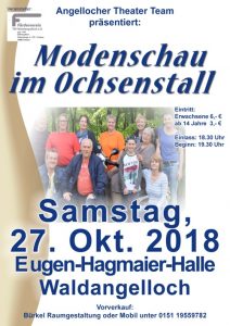 Das Angellocher Theater Team (ATT) wiederholt ihr erfolgreiches Stück vom Sommer mit dem Titel Modenschau im Ochsenstall, nach dem gleichnamigen Lustspiel von Jonas Jetten. Während der Pausen und im Anschluss an das Stück bietet Ihnen der Förderverein Speisen und Getränke an.