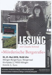 (zg) Am Dienstag, 21. Mai 2019 veranstaltet die Ortsbücherei Ittlingen und die Buchhandlung Doll eine Lesung mit Claudia Schmid „Mörderische Bergstraße“.
