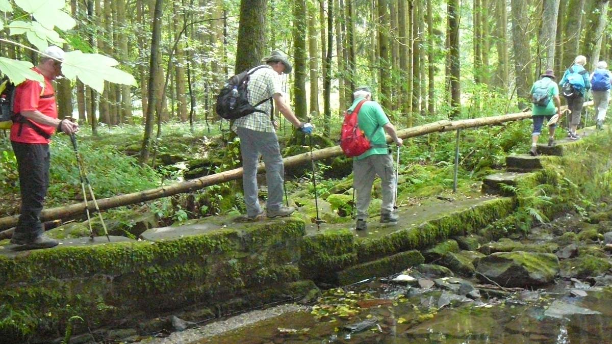 Unser Mitglied Ilse Giese hatte zur Mühlenwanderung bei Limbach eingeladen. Mit einer Gruppe von 20 Wanderfreunden startete die Mühlentour an der Limbacher Mühle, welche uns vom letzten Jahr noch in guter Erinnerung war. Dieses Mal wanderten wir bei schwülwarmen Temperaturen stetig leicht bergauf nach Scheringen. Vorbei an Streuobstwiesen führte uns die Tour weiter nach Einbach. Hier war eine kurze Rast geplant, welche wir kurzerhand aufgrund des einsetzenden Regens ins dörfliche Begegnungshaus verlegten. Vom Geoparkführer Herr Fischer, ehemaliger Lehrer, welcher mittlerweile zu uns gestoßen war, wurden uns die dörflichen und geschichtlichen Begebenheiten von Einbach nähergebracht. So erfuhren wir viel über die Römerstraße, welche durch den Ort führt. Rechtzeitig hatte der Regen aufgehört und so konnten wir unsere Wandertour trockenen Fußes fortsetzen. Unser Weg führte uns an alten Mühlen vorbei. Natürlich wurde auch Ilses ehemaliges Feriendomizil angesteuert, einsam und idyllisch mitten im Wald oberhalb des Flüsschens Elz gelegen. Auf engen Pfaden und Hohlwegen wanderten wir auf dem Pilgerweg, wobei wir die beschauliche Elz mehrmals auf historischen Brückenstegen überqueren mussten. Noch ein letztes Mal ein kurzer, steiler Aufstieg war zu überwinden, bevor es entlang der Elz bergwärts zurück zu unserem Ausgangspunkt Limbacher Mühle zurückging.