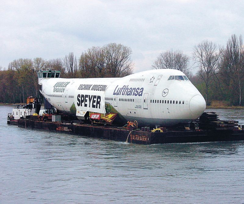 Die Techniker des Museums verbrachten Monate damit das Flugzeug auseinander- und wieder zusammenzubauen. Eine kniffelige Angelegenheit, denn solch ein Projekt war für die Männer neu und Erfahrungswerte von Experten gab es nur begrenzt. Die erste Etappe von Frankfurt zum Flughafen Karlsruhe / Baden-Baden konnte noch fliegend zurückgelegt werden. Beim nächsten Schritt wurden die „kleineren“ Einzelteile, wie die Tragflächen, per Tieflader nach Speyer gebracht. Das größte Problem jedoch stellte der Transport des 70 Meter langen Rumpfes dar. Ein Straßentransport war ausgeschlossen, doch zum Glück gibt es in Speyer den Rhein. Auf einem speziellen Ponton gelang der Rumpf zum Naturhafen Speyer. Ein Anblick der auch heute noch vielen gut in Erinnerung geblieben ist, denn wann sieht man schon mal einen halben Jumbo Jet auf dem Wasser? Im Naturhafen angekommen, ging es dann auf dem Landweg zur nur noch fünf Kilometer entfernten neuen Heimat. Tausende Interessierte begleiteten den letzten Weg des Flugzeugs, der nach zwei Stunden erfolgreich endete. Die Boeing 747 zählt zu den Hauptattraktionen des Technik Museum Speyer. Der Blick aus luftiger Höhe vom begehbaren Flügel, wie auch der schnelle Abstieg über die Riesenrutsche stehen bei den Besuchern hoch im Kurs und begeistern jährlich Tausende.