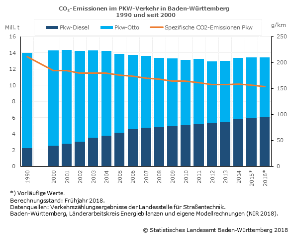 Nach vorläufigen Berechnungen des Statistisches Landesamtes betrugen die Kohlendioxidemissionen (CO2-Emissionen) des Pkw-Verkehrs im Jahr 2016 13,4 Millionen Tonnen und lagen damit auf Vorjahresniveau. Gegenüber 1990 entspricht das einer Reduktion von etwa 4 %.