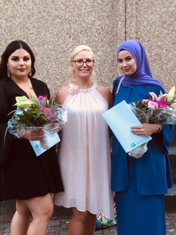 Adeviye Islak (rechts) und Lisa Buchmann (links) auf der Examensfeier mit Hausleiterin Madeleine Hoffmann