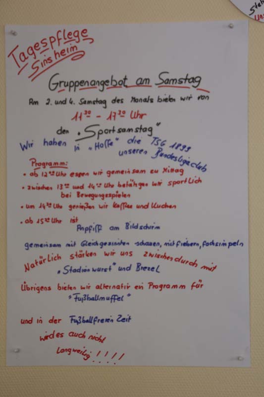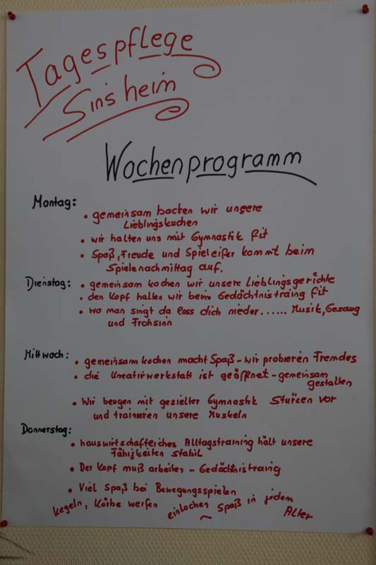 Die freundlichen gut ausgebildeten Fachkräfte gehen gerne auf die Wünsche ihrer Pflegebedürftigen ein. Wer seinen Tag in Gesellschaft verbringen möchte kann bequem von daheim abgeholt werden und wieder zurückgebracht werden. Gemeinsames Frühstücken lässt den Tag positiv beginnen, das weitere Tagesprogramm wird den Bedürfnissen individuell angepasst. Zum Ausruhen und relaxen stehen bequeme Ruhesessel oder ein Terassenbereich bei gutem Wetter zu Verfügung.