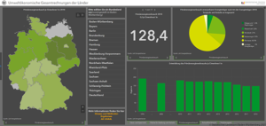 Antworten auf diese und weitere Fragen liefern die aktualisierten Internettabellen und das neu erstellte interaktive Dashboard (siehe Abbildung) mit ausgewählten Umweltindikatoren des Arbeitskreises »Umweltökonomische Gesamtrechnungen der Länder« (AK UGRdL), die nun im Statistikportal bereitstehen. Dort finden sich auch viele weitere Kenngrößen, z. B. zum Wassereinsatz, zur Nachhaltigkeit der Flächennutzung, zum Energieverbrauch, zu den Treibhausgasemissionen, zum Kraftfahrzeugbestand in den Wirtschaftszweigen oder zur Rohstoffnutzung.