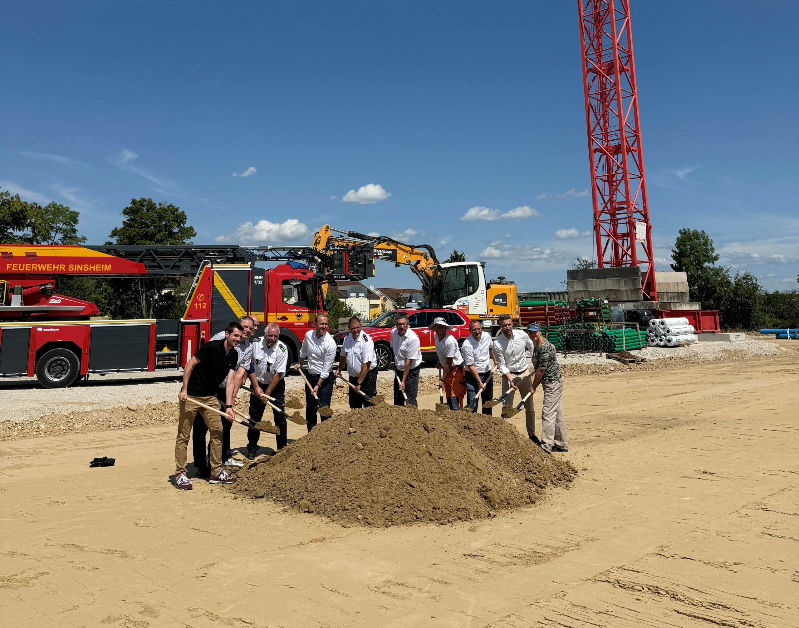 Auf dem Gelände der ehemaligen Autobahnmeisterei in Sinsheim haben Ende Juni 2025 die Rohbauarbeiten für das neue Feuerwehrgerätehaus begonnen. Bereits im vierten Quartal 2024 starteten die vorbereitenden Erdarbeiten. Am 4. Juli versammelten sich Oberbürgermeister Marco Siesing, Dezernatsleiter Ulrich Landwehr, Vertreter der Stadt, Mitglieder der Feuerwehr sowie der Gemeinderatsfraktionen und der Erdbaufirma Schneider Bau zum symbolischen Beginn des Hochbaus.