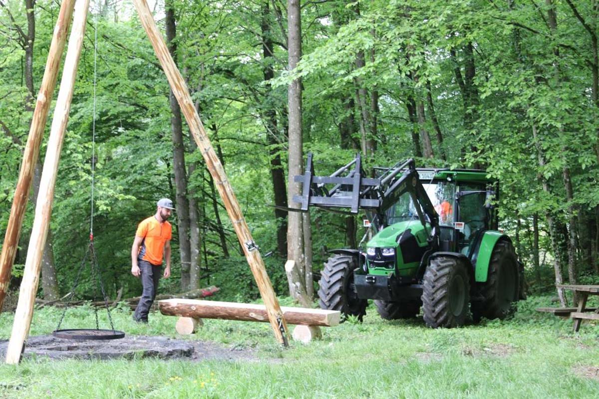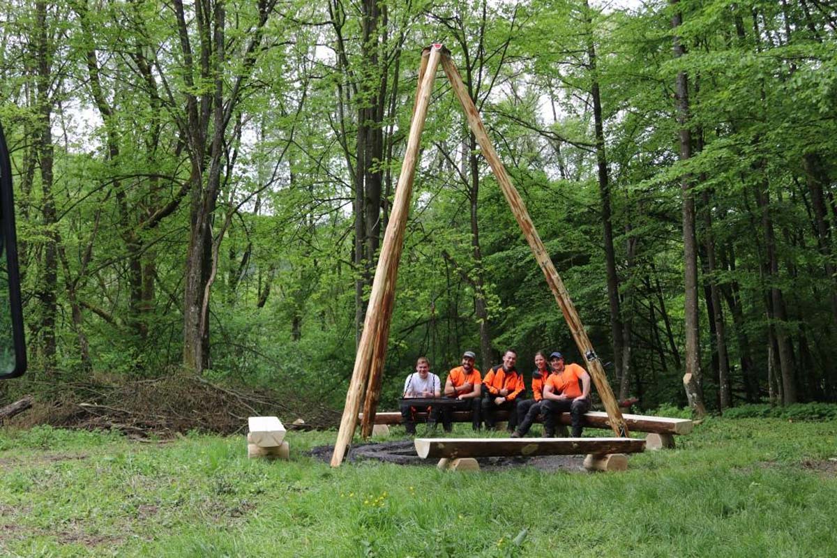 Aus entrindeten Stämmen haben die Auszubildenden ein massives Dreibein für den Grillrost aufgestellt. Rings um die Feuerstelle bieten neue Holzbänke ausreichend Platz auch für größere Festgesellschaften. Im Schatten der stattlichen Bäume kann man sich vom Spielen und Toben auf der großen Wiese ausruhen. Bei unerwartet schlechtem Wetter bietet die Grillhütte Schutz.