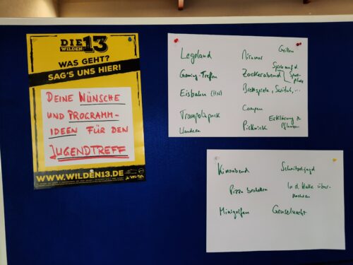 Im zweiten Teil des Nachmittags ging es darum, gemeinsam mit den Verantwortlichen zu überlegen, wie der Jugendtreff „Basement 21“ zukünftig aussehen kann. Die Jugendlichen waren dabei sehr kreativ und konnten den Mitarbeiterinnen in kurzer Zeit eine ganze Palette an Ideen ausbreiten. Nach ihren Wünschen zur Programmgestaltung gefragt, schlugen die jungen Adersbacher Aktionen wie Eislaufen, Minigolf, Ausflüge zum Trampolinpark oder ins Erlebnisbad vor. Ebenso benannten sie auch Angebote wie ein Gaming-Treffen, einen Kinoabend und eine Gruselnacht. Auch klassische Programmpunkte der Jugendarbeit wie Grillen, Wandern, Brettspiele oder eine Schnitzeljagd tauchten auf der Wunschliste auf. Ein besonderes Highlight haben sich die Mitarbeiterinnen für den Neustart bereits überlegt: In den Herbstferien ist ein Ausflug zum Erlebnispark Tripsdrill geplant, bevor dieser in die Winterpause geht.