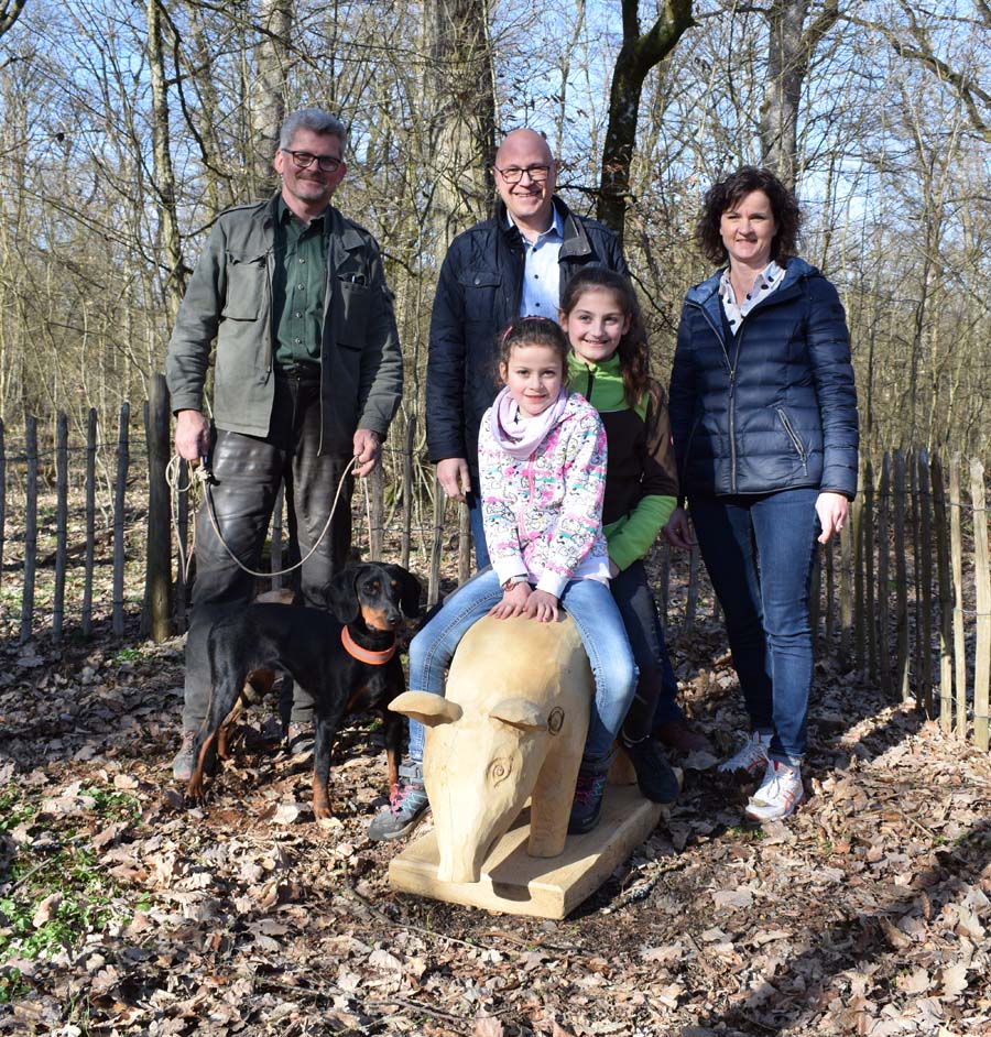 (zg) Vor fünf Jahren wurde um den Eichelberg auf Hilsbacher Gemarkung der „Erlebnisweg Hilsbacher Eichelberg“ angelegt. Schon einige Zeit vorher gab es an der höchsten Stelle über den Weinbergen einen Aussichtspunkt, den die Forstverwaltung mit Hilfe von Spenden eingerichtet hatte. Für die Erwachsenen ist dieser Aussichtspunkt das Highlight des Erlebniswegs – für die Kinder gibt es Fips – das Eichhörnchen, das auf 13 Stationen über die gesamte Wegstrecke mit Rätseln und Erklärungen die Aufmerksamkeit auf sich zieht. Station 2 beschreibt die Kulturbaumart Eiche. Dafür wurde ein Gehege mit einer Gruppe von Holzschweinen angelegt. Eins davon musste ausgetauscht werden, weil es verwittert war. Jetzt hat man zur Herstellung stabiles Eichenholz verwendet. Im Beisein von Orstvorsteher Martin Gund, Forstrevierleiter Dietmar Weiland und Johanna Barth -Tourismusbeauftragte der Stadt Sinsheim – wurde das Schwein an seinen Platz im Gehege gestellt.