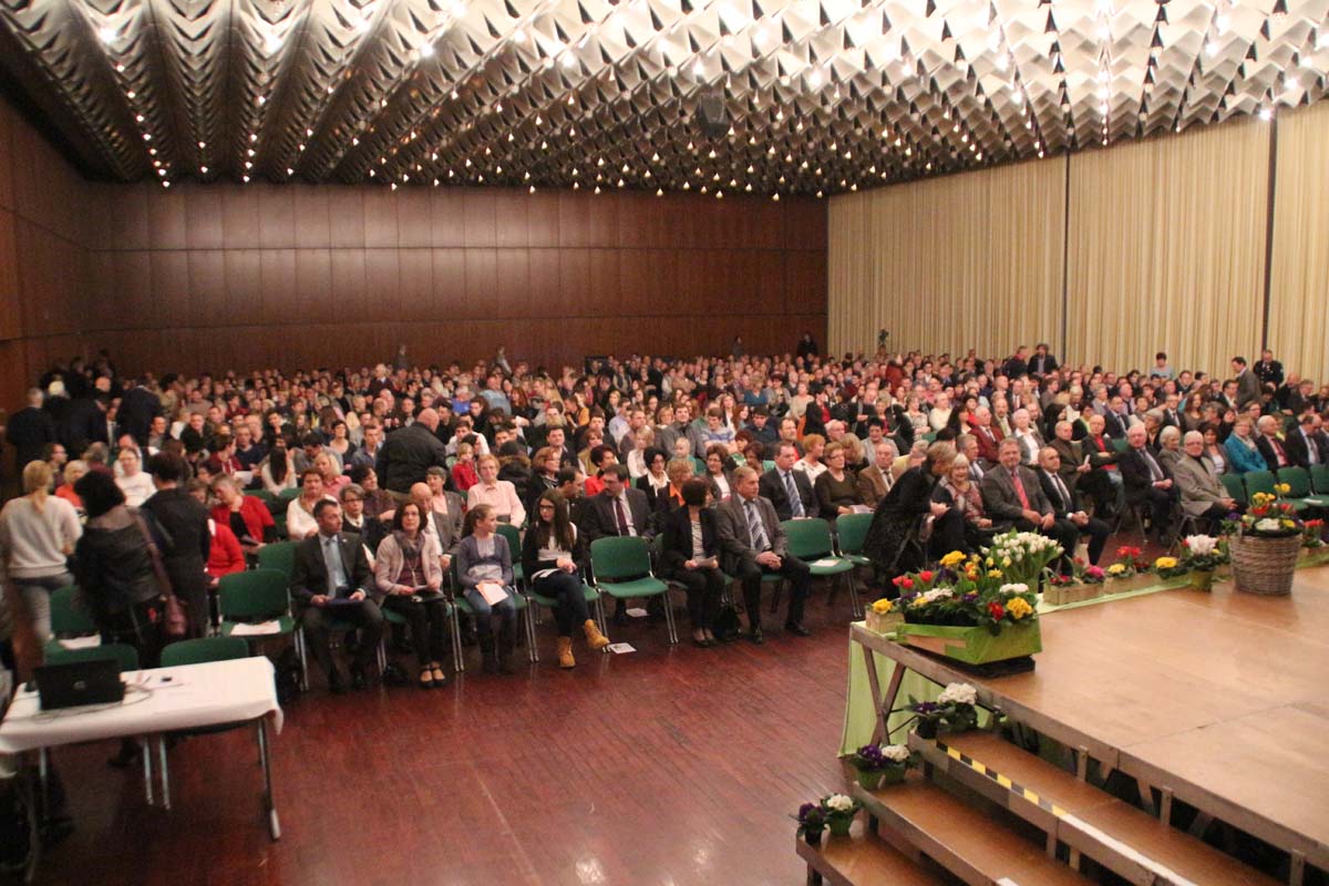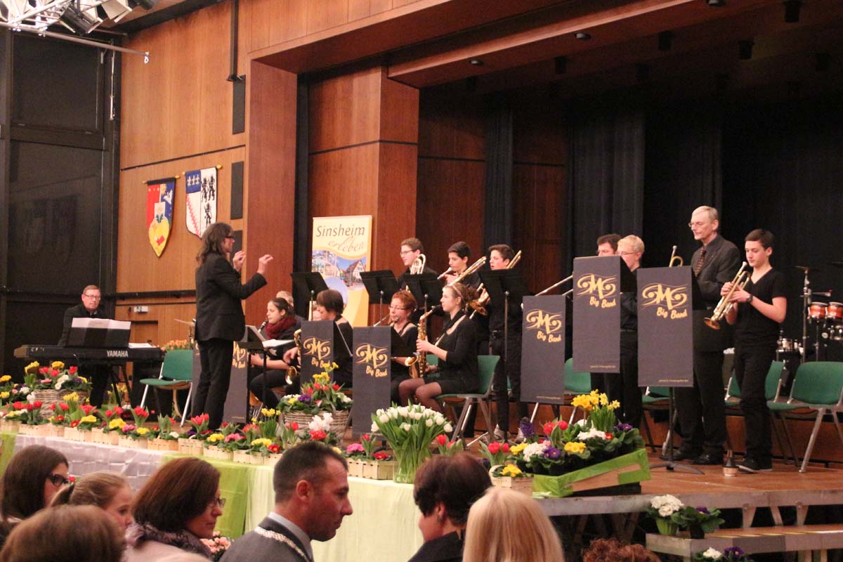 In der vollbesetzten Halle mit einer frühlingshaft geschmückten Bühne stimmte die Big Band der Städt. Musikschule das Publikum auf den zu erwartenten ehrenvollen Empfang ein. Oberbürgermeister Jörg Albrecht gabeinen etwas längeren Rückblick auf das Jahr 2014, sowie einen Ausblick auf das Jahr 2014. Trotz vielen Projekten im vergangenen Jahr kam es zu keiner Neuverschuldung. Für das kommende Jahr wird man versuchen die Neuverschuldung in Grenzen zu halten, jedoch muss einiges auf den Weg gebracht werden.