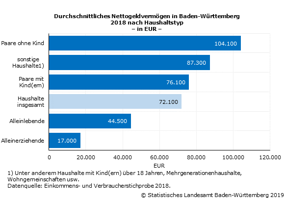 Berücksichtigt man zusätzlich die durchschnittlichen Konsumentenrestschulden sowie Ausbildungskreditschulden in Höhe von zusammen 2 500 Euro je Haushalt, so beläuft sich das durchschnittliche Nettogeldvermögen je Haushalt in Baden-Württemberg auf 72 100 Euro.3