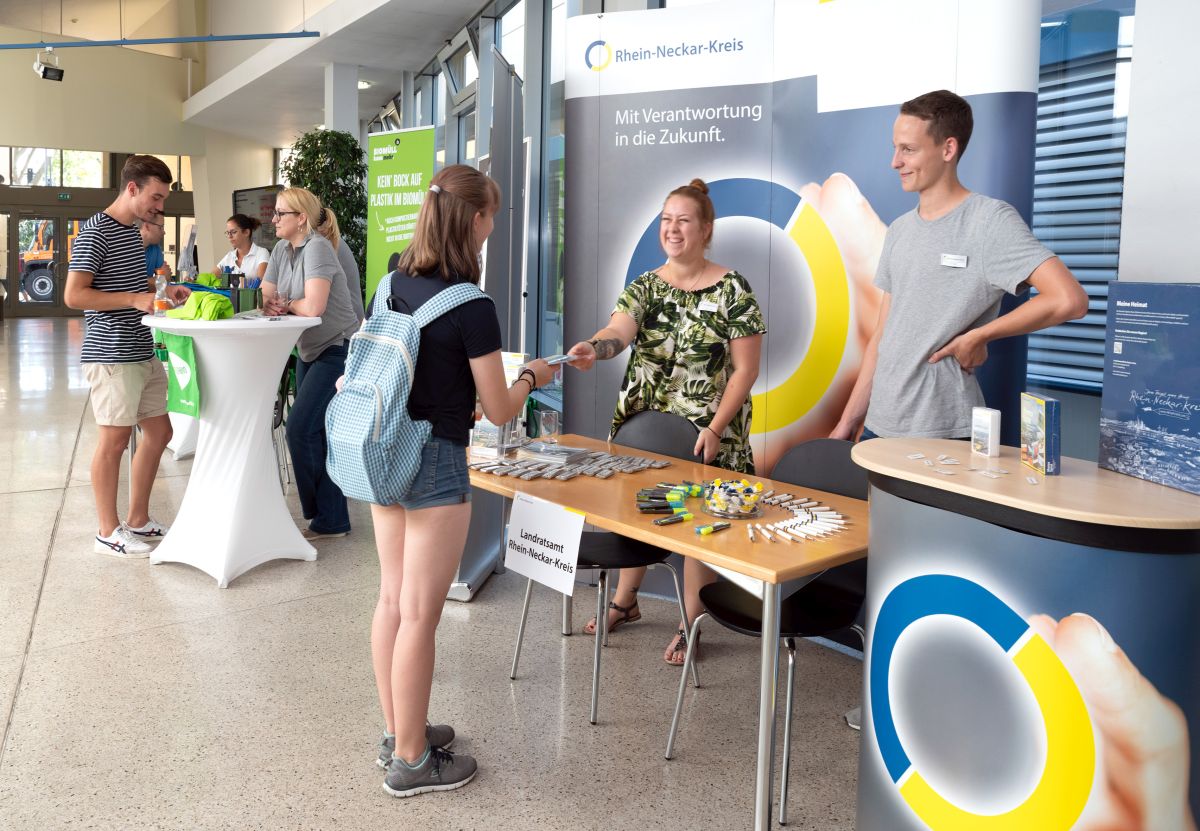 Ergänzt wurden die verschiedenen Infostände der Fachbereiche und AVR-Unternehmen durch eine „Hausführung“ durch das Verwaltungsgebäude in der Heidelberger Kurfürsten-Anlage, geführt von Auszubildenden des Landratsamts.