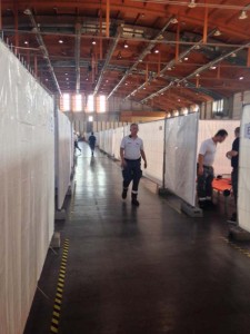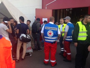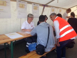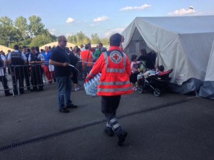 Bis in den Freitagmittag hinein wurden Essensausgabe, Gebetsraum, mobile Duschen, Waschmaschinen und Arzträume eingerichtet und waren pünktlich zum Empfang startklar. Rund 90 Helfer aus Bereitschaften, Ärzten, Krankentransport und Dolmetschern waren stressfrei gewappnet für die Erstankunft.