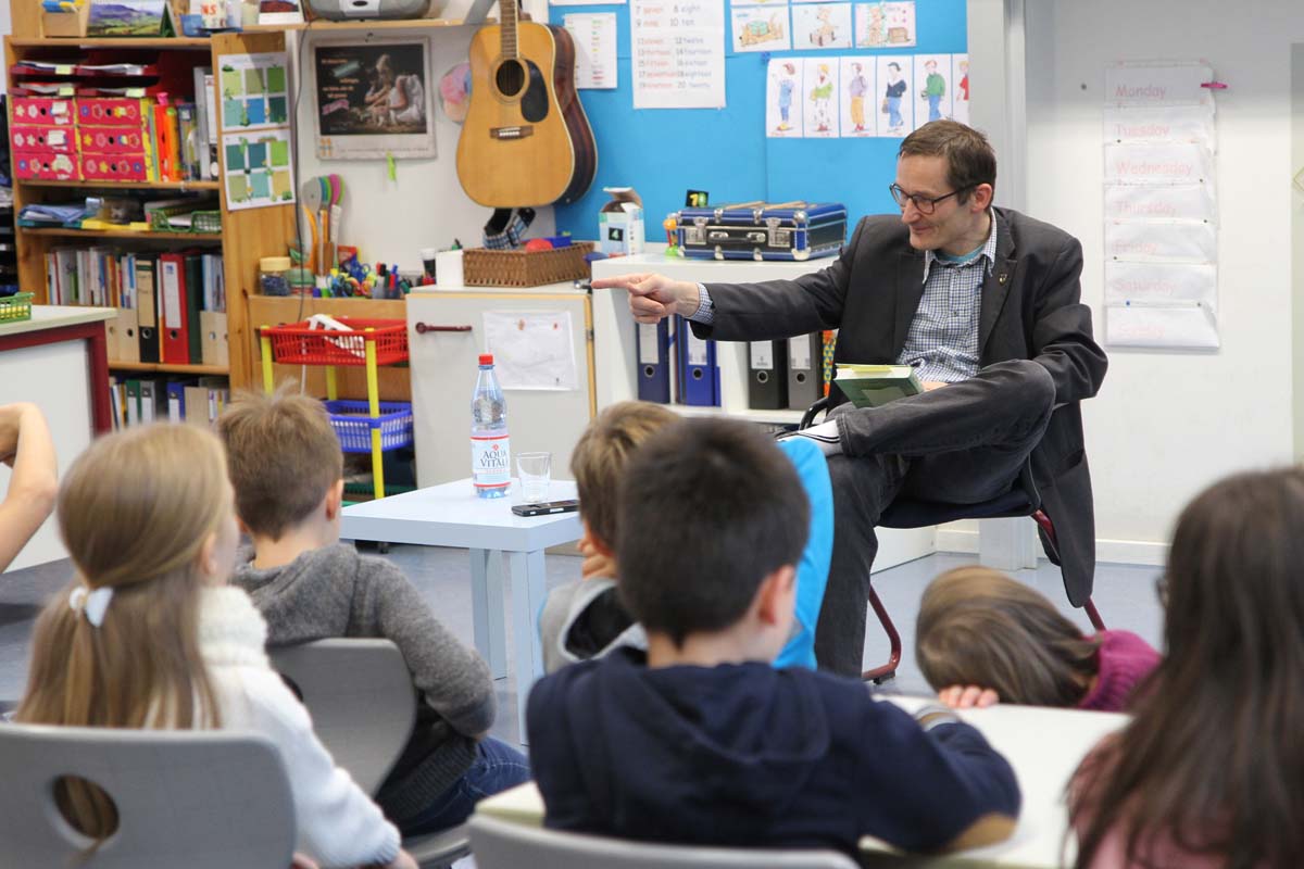 Beim Vorlesen senkt Katzenstein die Stimme als erzähle er ein Geheimnis und die Kinder hören gebannt zu. Henry, so heißt der Junge im Buch, wünscht sich eigentlich einen Hund. Aber nun muss er sich um dieses haarige Etwas kümmern, das hingebungsvoll an seinem Hausschuh nagt. „Was um alles in der Welt frisst ein Mammut?“, fragt Katzenstein in die Runde.