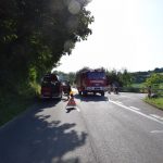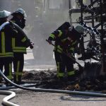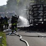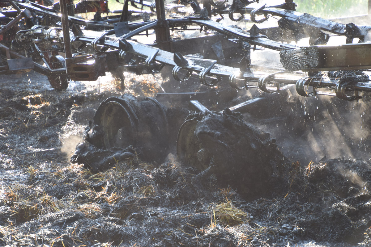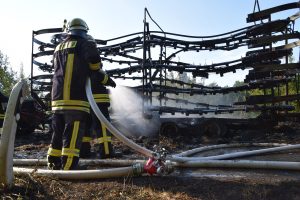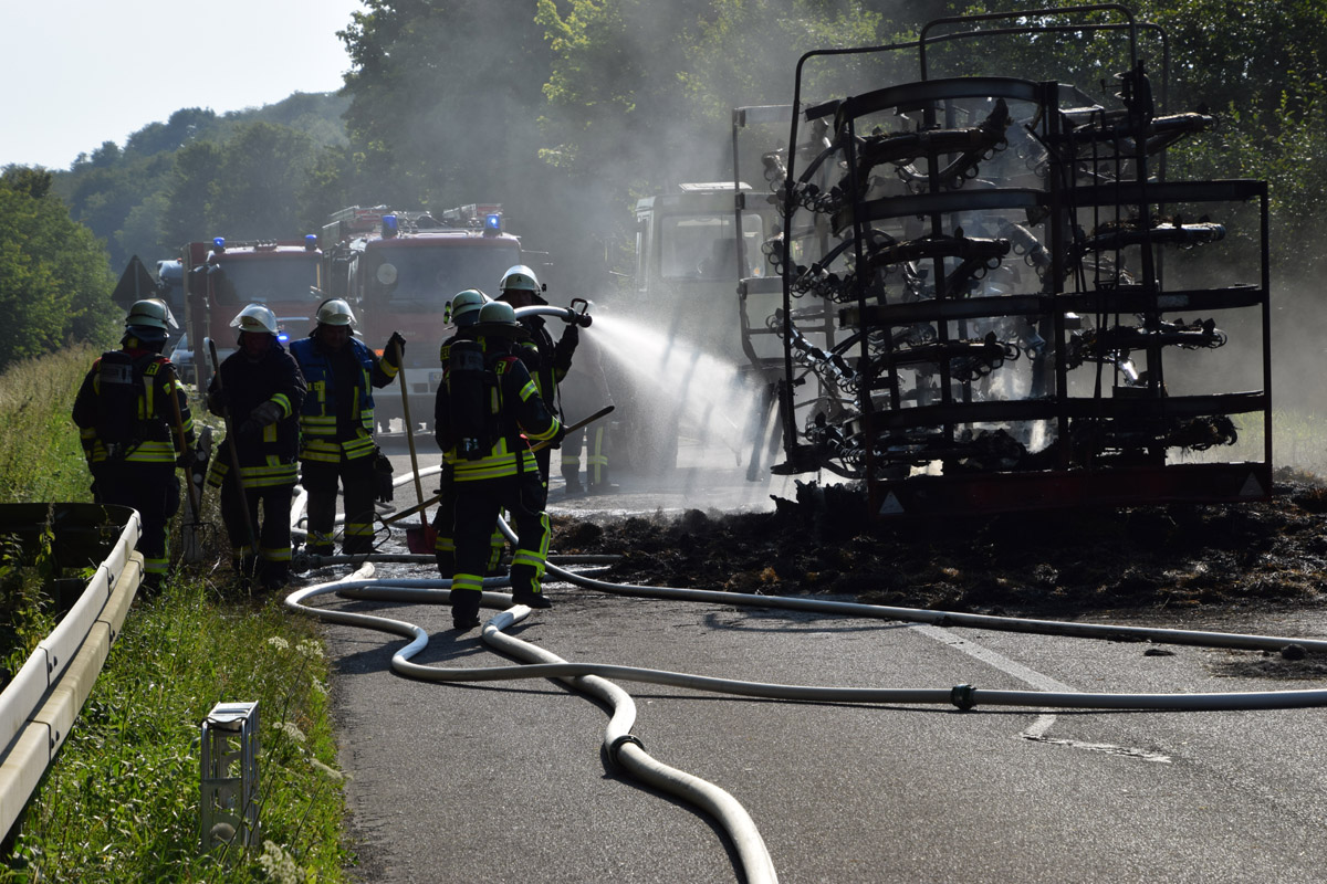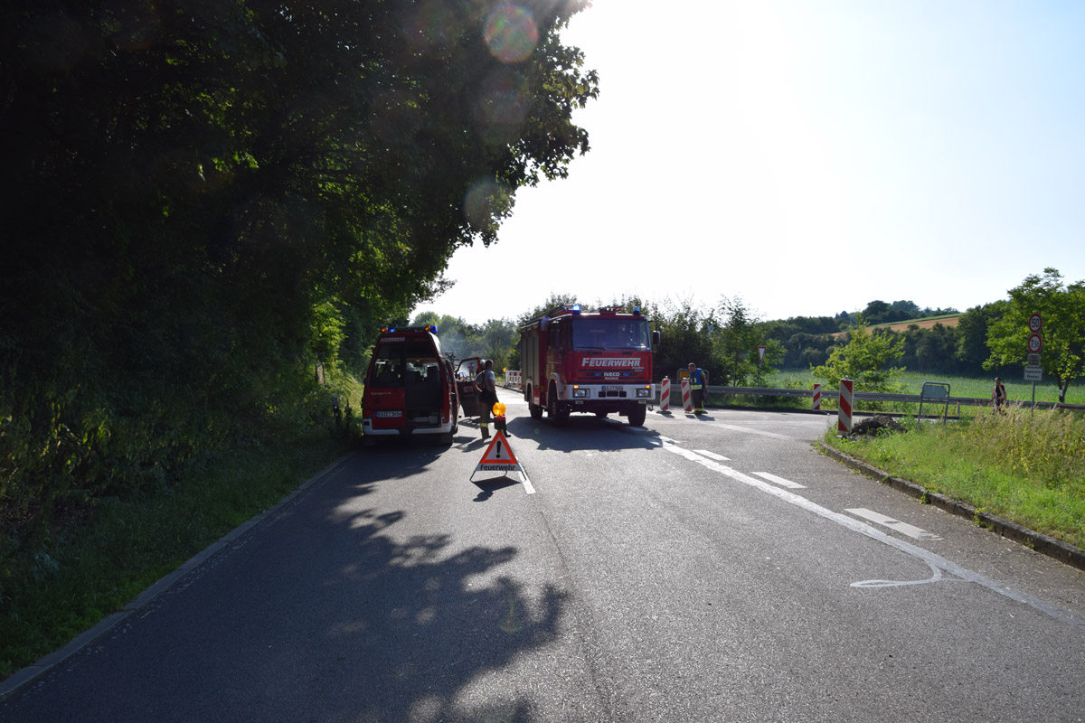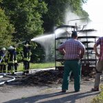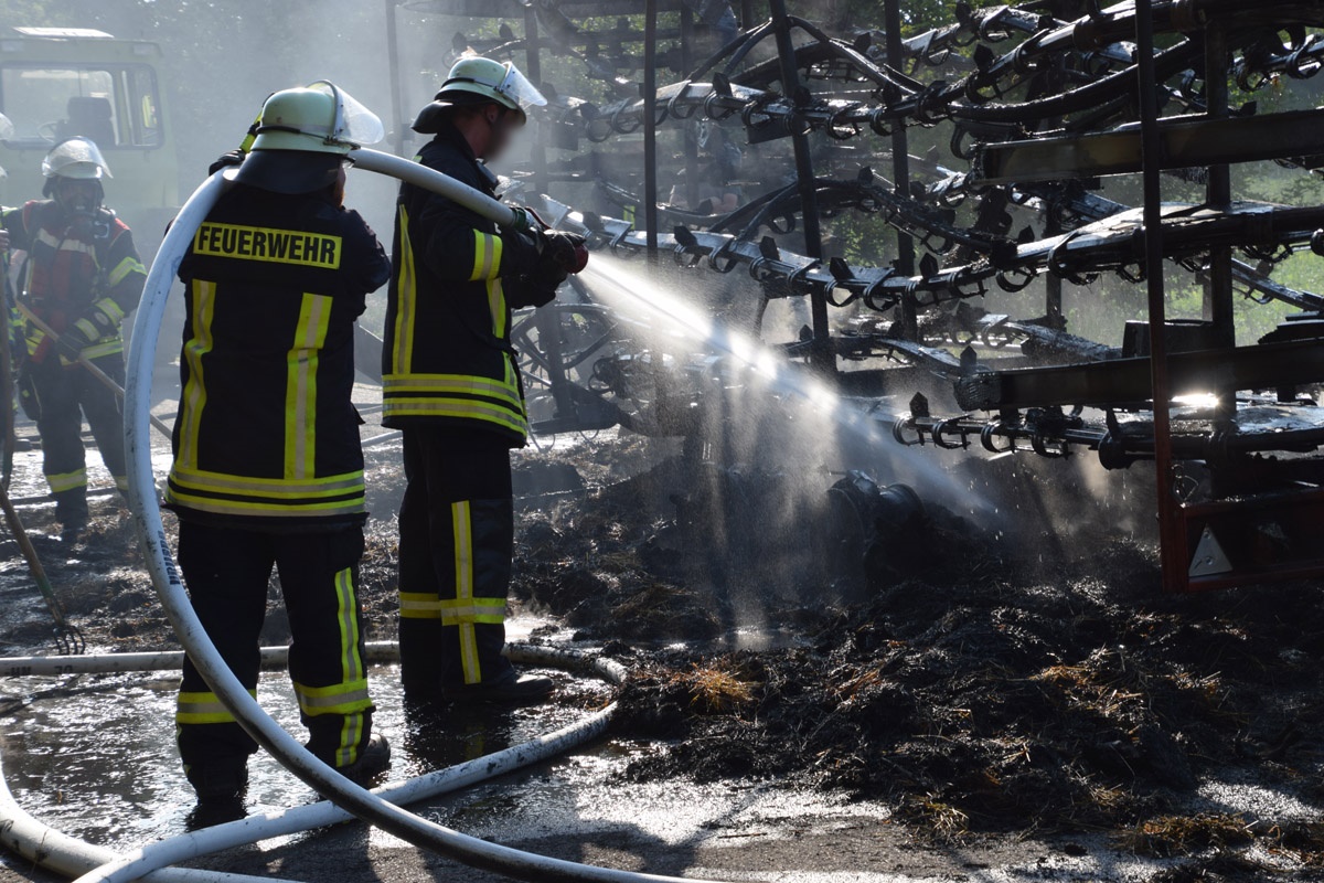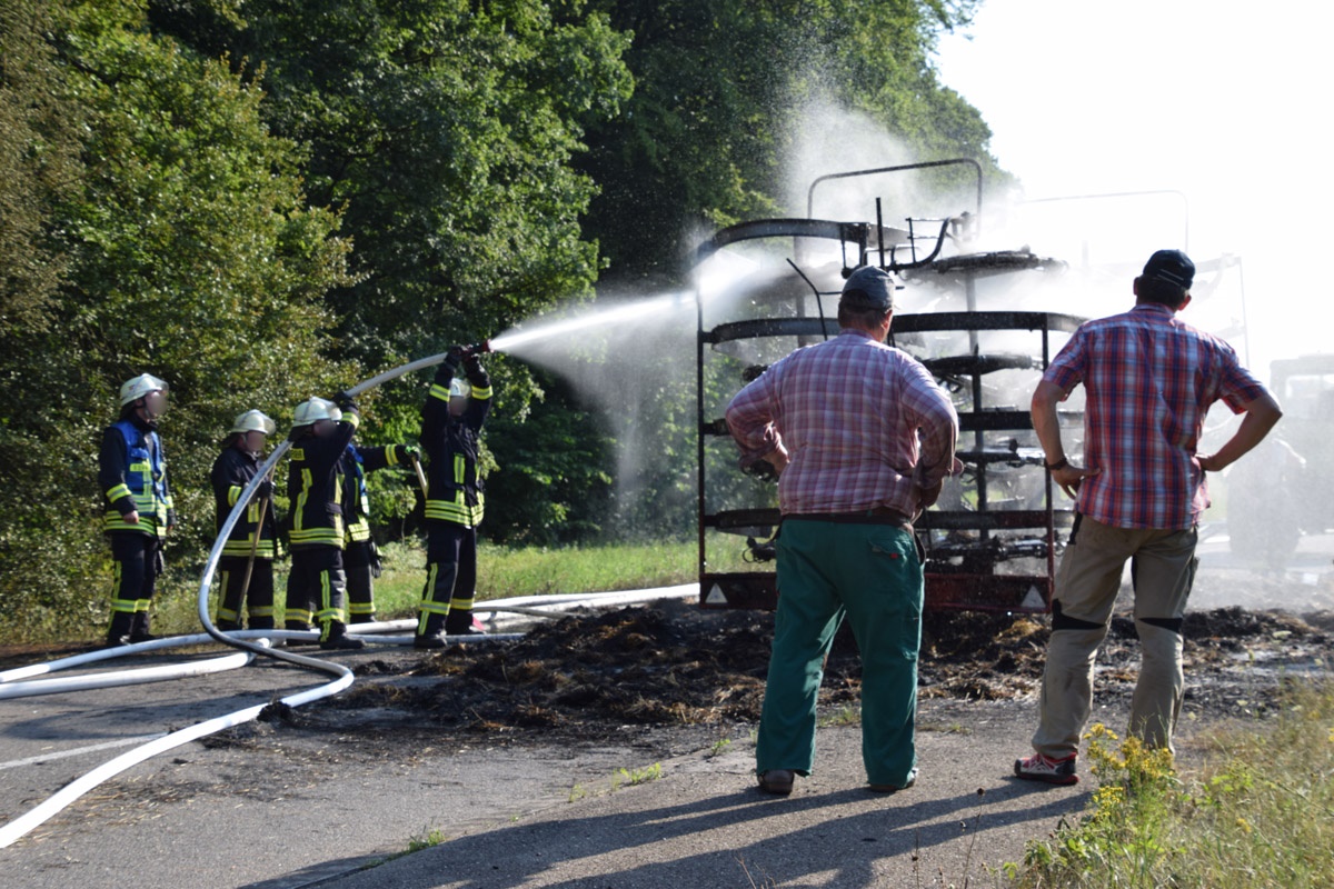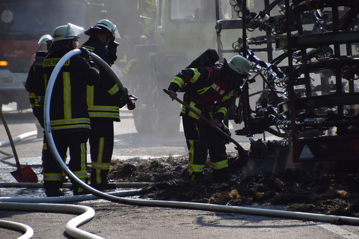 Östringen-Odenheim. (red) Die enorme Hitze setzt Mensch wie Maschine zu: Die Fahrt mit Traktor und Ballensammler endete am vergangenen Donnerstagabend in einem größeren Feuerwehreinsatz. Ein Landwirt war mit seinem voll beladenen Ballensammelwagen auf der K3517 zwischen Odenheim und Eichelberg unterwegs, als sein Anhänger plötzlich zu qualmen und schließlich zu brennen begann. Schnell verständigte er die Feuerwehr – Wehrmänner aus Östringen, Odenheim und Eichelberg rückten mit 35 Kräften an die Einsatzstelle und begannen mit einem Schnellangriff die Flammen zu bekämpfen. Denn diese hatten bereits auf die Böschung übergegriffen, auch beim Traktor bestand die Gefahr eines Brandübergreifens. Der Anhänger brannte vollständig aus. Ein Pendelverkehr mit Löschwasser wurde eingerichtet, um die enormen Mengen Stroh gezielt ablöschen zu können. Die Strecke war für die Dauer der Löscharbeiten rund eine Stunde gesperrt, der Verkehr wurde örtlich umgeleitet. Über die Höhe des entstandenen Sachschadens lagen bei Redaktionsschluss noch keine Angaben vor. Am Rande des Geschehens sorgte ein Verkehrsunfall für Aufsehen: Ein Peugeot-Transporter war kurz vor der Feuerwehr-Absperrung einem abbremsenden Motorrad aufgefahren, hier blieb es zum Glück nur bei Sachschaden.