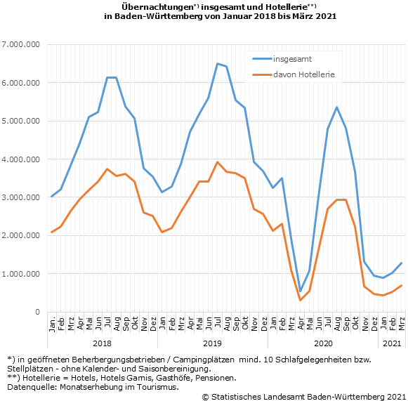 Angesichts der globalen Ausbreitung des Coronavirus wurden in Baden-Württemberg Mitte März 2020 zunächst unter anderem Messen, Ausstellungen, kulturelle Veranstaltungen und Freizeitangebote eingeschränkt oder ganz abgesagt. Hinzu kamen weltweit Reisewarnungen für Touristen sowie Grenzschließungen. Mit Inkrafttreten der Corona-Verordnung des Landes Baden-Württemberg zum 17. März 2020 wurde dann der Betrieb von Beherbergungsbetrieben, Campingplätzen und Wohnmobilstellplätzen für touristische Zwecke im Land vorübergehend untersagt. Eine Beherbergung durfte ab diesem Stichtag lediglich noch ausnahmsweise zu geschäftlichen, dienstlichen oder in besonderen Härtefällen zu privaten Zwecken erfolgen. Bereits im Verlauf des März und verstärkt dann im April und im Mai 2020 waren deshalb zahlreiche Betriebe aufgrund der Corona-Pandemie geschlossen – im April 2020 auf dem ersten Höhepunkt der Krise ca. 45 %. Ab 18. Mai 2020 durften zunächst Ferienwohnungen und Campingplätze wieder für den touristischen Betrieb geöffnet werden. Ab 29. Mai 2020 folgten alle weiteren Beherbergungsbetriebe. Die anschließende über die Sommermonate und bis in den Herbst reichende Erholungsphase des Landestourismus fand Anfang November 2020 im Zug der sogenannten »Zweiten Welle« mit erneutem Lockdown und landesweiten Beherbergungsverboten ein vorläufiges Ende. Übernachtungsangebote waren zunächst bis Jahresende 2020 und letztlich dann bis auf Weiteres nur mehr zu geschäftlichen, dienstlichen oder – in besonderen Härtefällen – zu privaten Zwecken zur erlaubt. Im Mai 2021 – also mehr als ein Jahr nach Inkrafttreten der ersten Fassung der Corona-Verordnung befindet sich Deutschland weiterhin in der dritten Welle der Pandemie, wenn auch mit aktuell stark rückläufigen Inzidenzen. In ersten Bundesländern und Gebieten mit niedriger Inzidenz zeichnet sich ein Herunterfahren der Einschränkungen für die Beherbergungsbetriebe und für die Bevölkerung ab, wobei die Öffnungsstrategien der Länder und auch der Nachbarstaaten zum Teil unterschiedliche Schwerpunkte setzen. In Baden-Württemberg sind touristische Beherbergungen seit Mitte Mai 2021 wieder möglich, wenn die 7-Tage-Inzidenz in einem Stadt- oder Landkreis an fünf aufeinanderfolgenden Werktagen unter 100 liegt.
