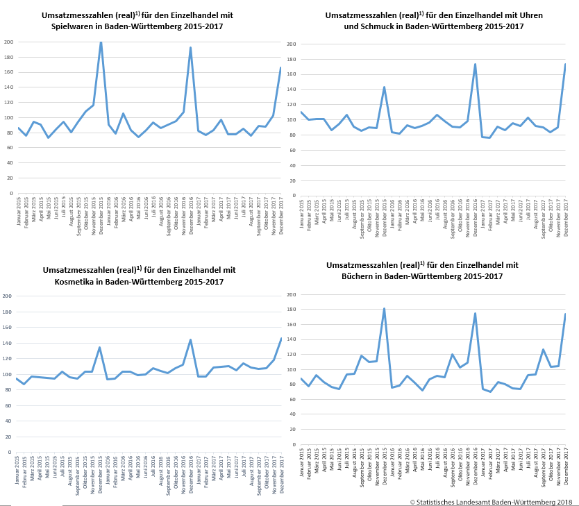 Das Weihnachtsgeschäft ist für Unternehmen vieler Branchen erfolgsentscheidend. Wie das Statistische Landesamt auf Grundlage der Ergebnisse der monatlichen Konjunkturerhebung im Einzelhandel Baden-Württembergs für den Zeitraum 2015 bis 2017 feststellt, schießen jeweils im November und Dezember eines Jahres insbesondere die Umsätze mit Spielwaren in die Höhe. In der Vorweihnachtszeit stark gefragt sind außerdem Uhren, Schmuck und Kosmetika. Ausgeprägte Umsatzspitzen zum Jahresende zeigt darüber hinaus der Einzelhandel mit Büchern.