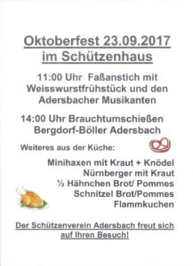 Am 23.09.2017 findet im Schützenhaus Adersbach unser diesjähriges Oktoberfest statt.