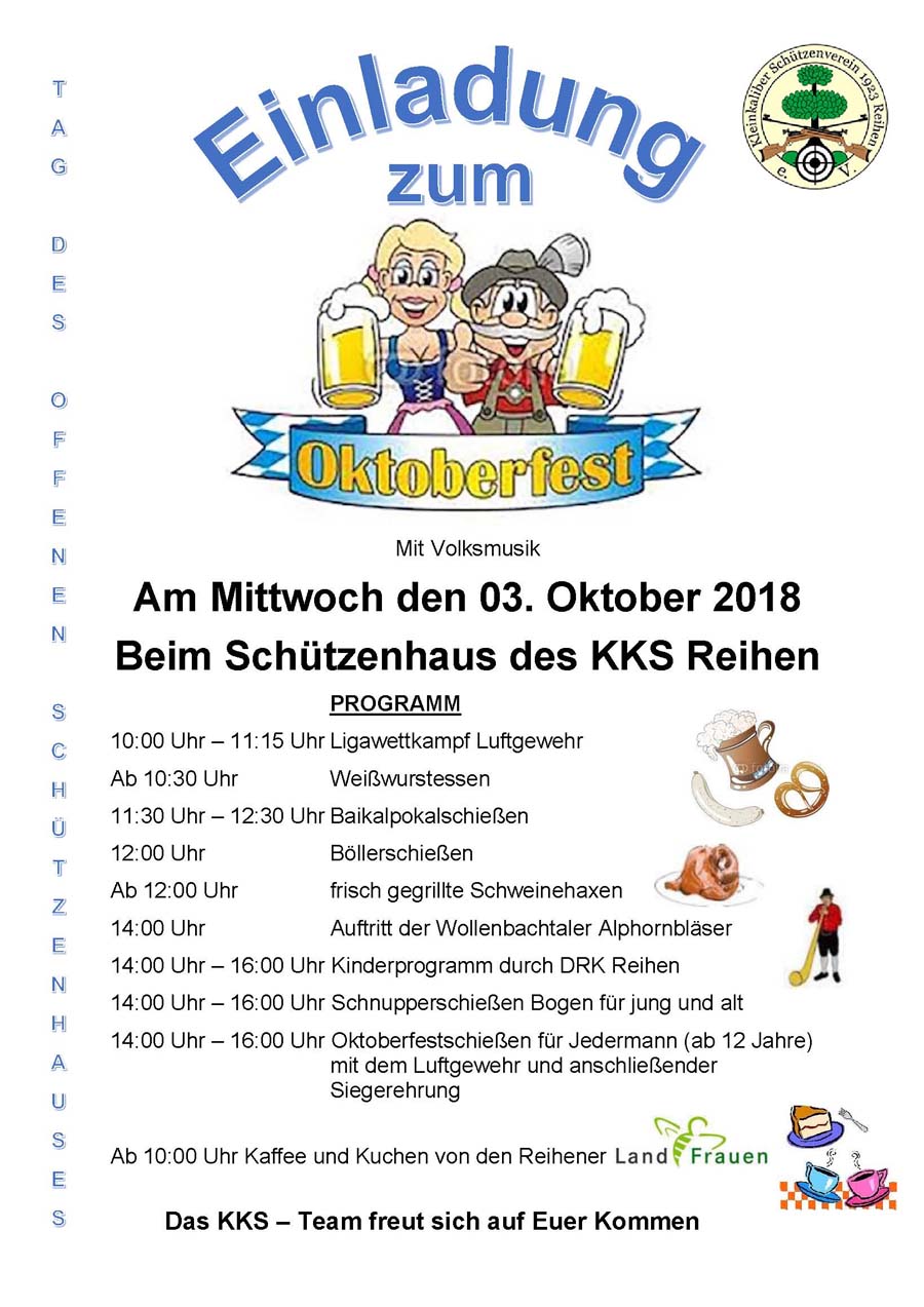 (zg) Oktoberfest am Mittwoch, den 03. Oktober beim Schützenhaus in Reihen. Um 10 Uhr Beginn mit Ligawettkampf Luftgewehr. Ab 10.30 Uhr Weißwurstessen. Zwischen 11.30 Uhr und 12.30 Uhr findet das Baikalpokalschießen statt. Um 12 Uhr Böllerschießen und frisch gegrillte Haxen. Ab 14 Uhr spielen die Wollenbachtaler Alphornbläser, startet das Kinderprogramm des DRK, das Schnupperschießen-Bogen sowie das Oktoberfestschießen-Luftgewehr für Jedermann mit anschließender Siegerehrung. Die Reihener Landfrauen sorgen für Kaffee und Kuchen. Das KKS-Team freut sich auf Ihren Besuch.