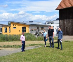 Oberbürgermeister Jörg Albrecht, Dezernatsleiterin Katharina Scherhag, BEG-Vorstand Florian Oess und Daniel Knoll, Geschäftsführer der Sonnige Projekte UG, besichtigten die Anlage vor Ort und erläuterten das Konzept der nachhaltigen Stromversorgung.