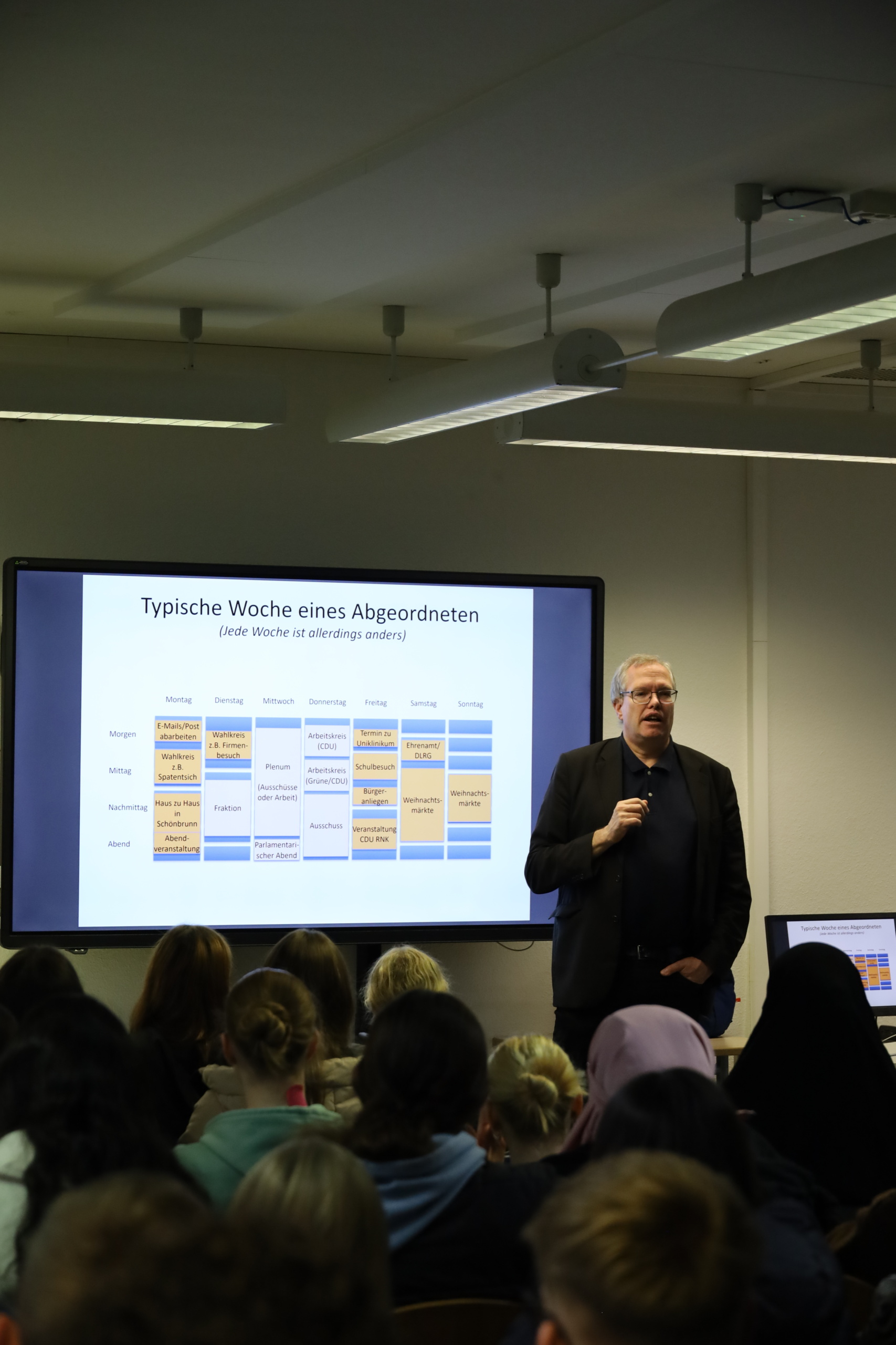 Dass die aktuellen Geschehnisse und gesellschaftlichen Entwicklungslinien in einer Zeit multipler Krisen die jungen Menschen berührt, bekam Schütte dann im Nachgang des rund eineinhalbstündigen Austausches hautnah mit. Zahlreiche Schülerinnen und Schüler nutzten die Gelegenheit, um mit dem Landtagsabgeordneten noch über ihre Fragen zum Krieg im Nahen Osten, dem Krieg in der Ukraine und die Migrationspolitik zu diskutieren. „Die heutige Jugend wächst mit vielen Krisen und weniger Stabilitätsgefühl auf“, so Schütte. Es sei damit auch die Aufgabe von Schule, ihnen dabei zu helfen, die vielfältigen Nachrichten, die jeden Tag auf unterschiedlichen Kanälen auf die Schülerinnen und Schüler einprasseln, einzuordnen und Quellen zu bewerten.