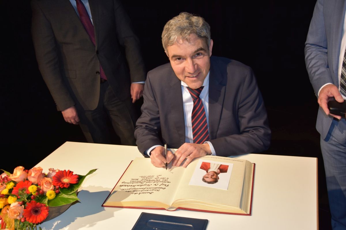 Bild (Stadt Sinsheim): Beim Besuch des Wirtschaftsforums Sinsheim in der Dr.-Sieber-Halle trug sich Professor Dr. Stephan Harbarth in das Goldene Buch der Stadt Sinsheim ein