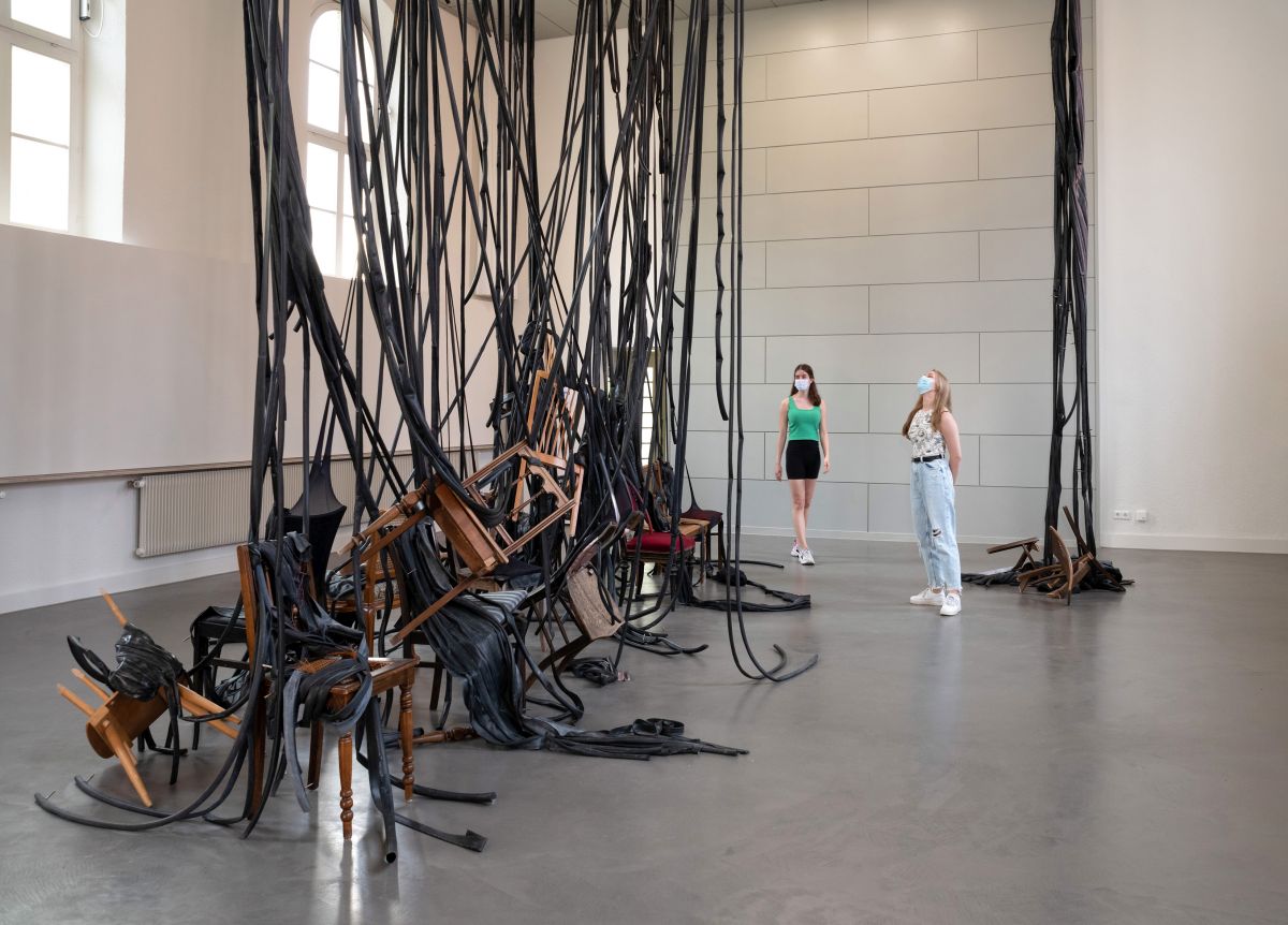 (Quelle: Landratsamt Rhein-Neckar-Kreis): Blick in die Ehemalige Synagoge Walldorf: Fritzi Haußmann, Go! Stop! Stay! Play! – die Reise nach…, 2020/2021, Rauminstallation (Stühle, Gummi, Nylon, Lack)