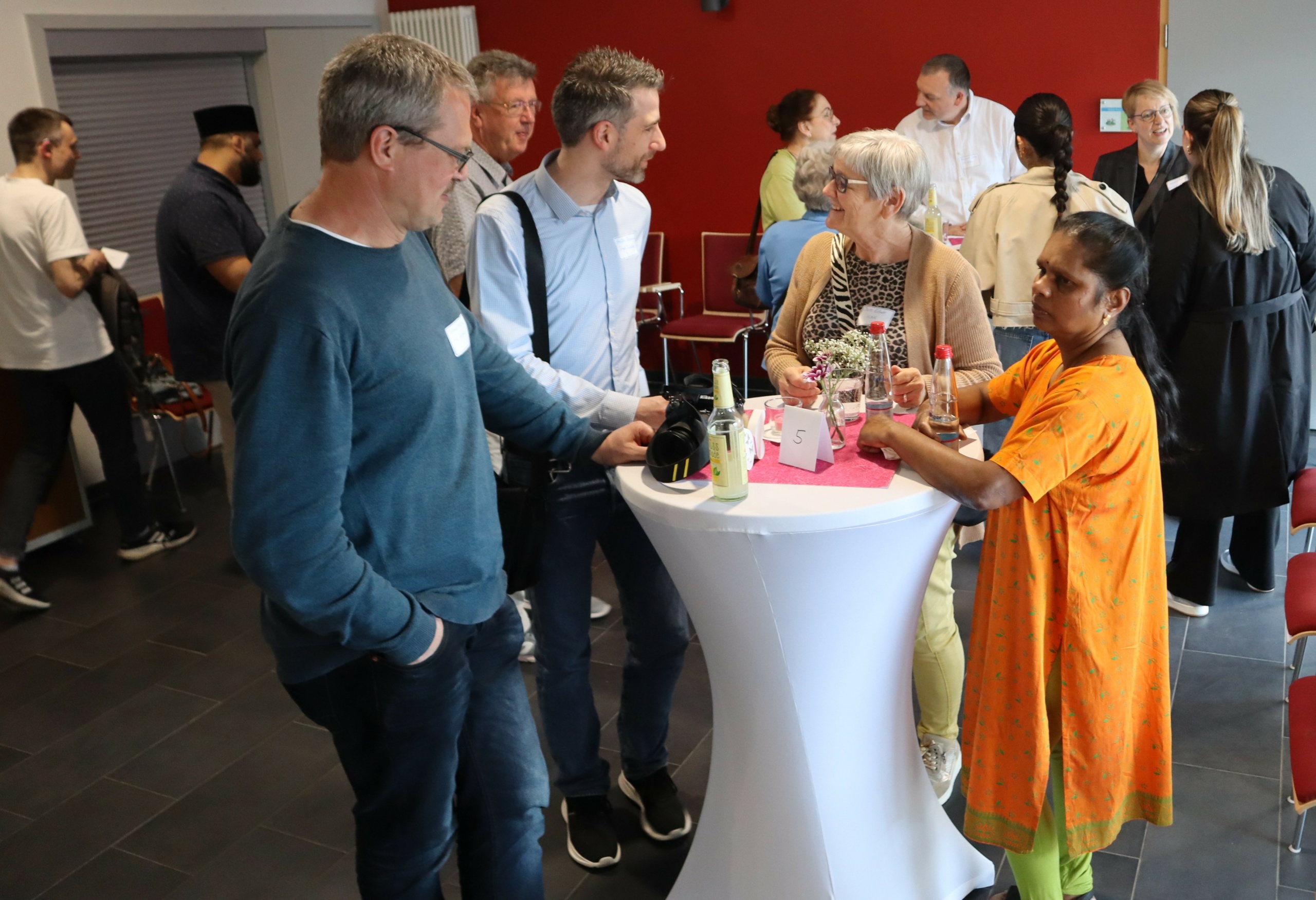 Schon im Eingangsbereich entwickelten sich erste Gesprächsrunden. Die Gäste wurden per Zufallsprinzip auf Stehtische verteilt, was schnell zu lebhaftem Austausch zwischen Menschen unterschiedlicher Herkunft und Glaubensüberzeugung führte.