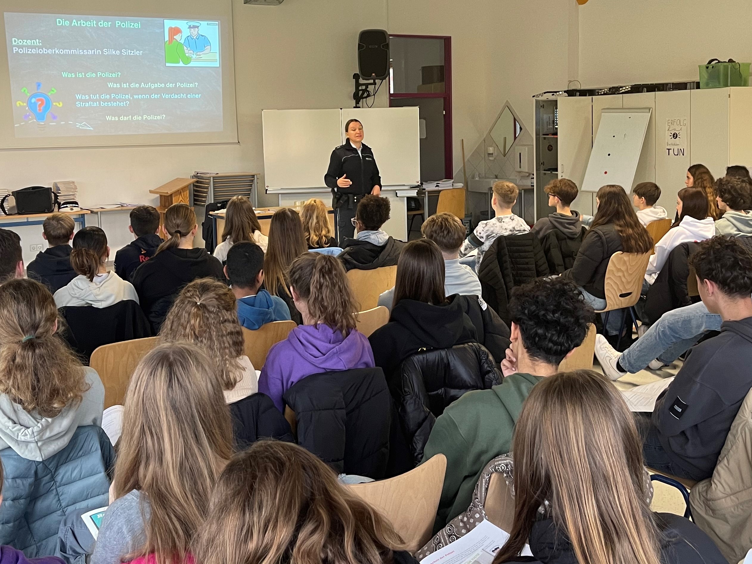 Im Mittelpunkt stand die Funktion des Rechtsstaates. Wenn jemand betrügt, einen anderen verletzt oder auf andere Weise schädigt greift der Rechtstaat ein und schützt die Bürgerinnen und Bürger. „Die Justiz und die Polizei sorgen dafür, dass wir in Deutschland friedlich zusammenleben können“, so eine Achtklässlerin auf die Frage, was von dem Projekt in Erinnerung bleiben wird.