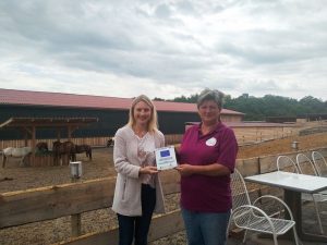 Nach längerer Planungs- und Bauzeit wurde der Reiterhof mittlerweile fertiggestellt. Ende Mai zogen die Ponys ein, auch Missy und Carry unterstützen Claudia Kohm jetzt als tierische Mitarbeiter. Die Halle wird bereits rege genutzt, unter anderem mit einem Pony-Führerschein im Sommerferienprogramm. Sulzfelds Bürgermeisterin und Vorsitzende des LEADER-Vereins, Sarina Pfründer, nahm dies zum Anlass für einen Besuch und übergab die Förderplakette. Diese macht nun am Eingang auf die finanzielle Unterstützung durch die Europäische Union und das Land aufmerksam.