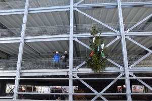 Oberbürgermeister Jörg Albrecht begrüßte die zahlreich erschienen Gäste, unter ihnen Baudezernatsleiter Tobias Schutz, der Leiter der Stadtwerke Andreas Uhler, Ortsvorsteher, Mitglieder des Gemeinderats sowie Verantwortliche und Mitarbeiter der beteiligten Firmen und der Stadtverwaltung. In Anbetracht der Wetterlage schritt man rasch zur Tat. Den Richtspruch sprachen Oberbauleiter Giuseppe Castronovo und Marcus Heide von der Firma Huber Integral Bau GmbH. Laut Bautagebuch war der Tag des Richtfestes der 112. Arbeitstag der Firma Huber Integral Bau GmbH auf der Baustelle des Parkhauses. In seiner anschließenden Ansprache vor einem kleinen Imbiss im Foyer der Dr.-Sieber-Halle, in die man aufgrund des noch immer vorherrschenden starken Windes ausgewichen war, bedankte sich Jörg Albrecht für das rege Interesse. „Das Parkhaus, das hier entsteht, ist ein Projekt von mehreren, welche die Attraktivität Sinsheims steigern und wesentlich zum verbesserten Stadtbild beitragen. Einem Stadtbild, das einer Großen Kreisstadt gut zu Gesicht steht. Parkhaus, Dr.-Sieber-Halle, Festplatz, Freibad – wenn man sich überlegt, was in den letzten Jahren alles entstanden ist, kann man zurecht stolz sein“, so der Oberbürgermeister.