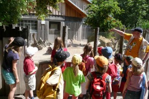 Mit „Fühltüten“, die mal mit Schlangenhaut, mal mit zarten Daunen gefüllt sind, wird der exzellente Tastsinn der Waschbären nachempfunden und beim Seiltanz auf einer dicken Stoffrolle merken die Kinder schnell, wie hilfreich es ist, wenn sie ihre Arme benutzen können, um das Gleichgewicht zu halten. So versteht man gleich besser, wozu vielen Affenarten ihr langer Schwanz dient: als ideale Balancierstange! Durch dieses spielerische und erlebnisorientierte Lernen werden schon den Kleinsten auf ganz einfache Weise wichtige Zusammenhänge vermittelt. Bevor die Kinder schließlich Tiger Tebo besuchen, den Neuzugang im Raubtierhaus, üben sie noch fleissig das Anschleichen. Vorsichtig pirschen sie an den Löwen vorbei, die der Gruppe interessiert hinterherschauen. Zum Ende der Veranstaltung werden 11 weitere quietschfidele „Zoo-Zwerge“ – die zweite Hälfte der Regenbogen-Gruppe – von Ranger Marc Horn zum vereinbarten Treffpunkt bei den Riesenschildkröten gebracht. Spätestens als auf die Frage, ob es ihnen denn gefallen habe, ein lautes einhelliges „Jaaaaaa!“ ertönt und die Rasselbande den beiden Zoorangern kräftig applaudiert, wird deutlich, dass der „Erlebnisreiche Rundgang“ auch für jüngere Kinder hervorragend geeignet ist.