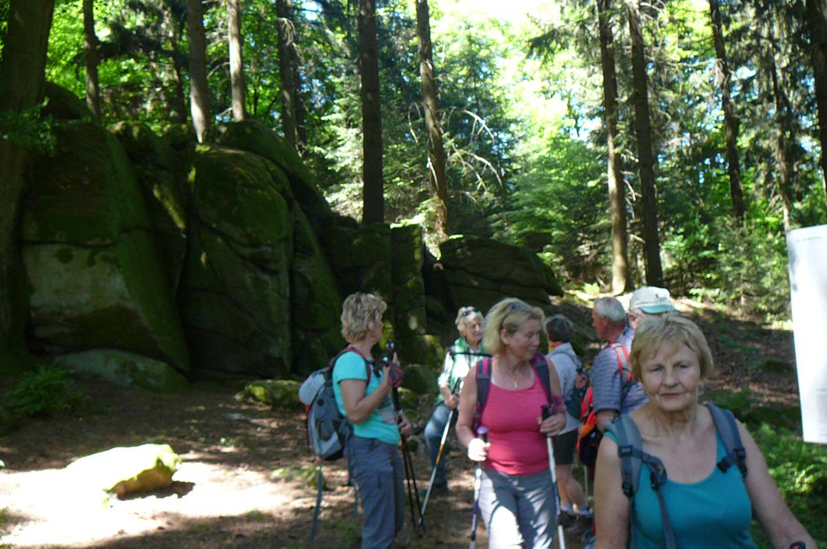 Gewandert wurde dieser Tage in Oberflockenbach bei sehr warmen Frühlingstemperaturen. Die Tour verlief auf zum Teil sehr steilen Pfaden durch den herrlichen Maienwald. Ausgehend von der Ursenbacher Höhe wanderte die 20 köpfige Gruppe auf dem Steinberg zur Keltenschanze, einem mythischen Kraftort. Wie zu einem Wall aufgehäuft, finden sich hier riesige Felsen. Weiter ging es dann talwärts nach Oberflockenbach, welches mit schönen alten Gebäuden punkten kann. Anschließend erfolgte der schwierigste Teil der Wanderstrecke, der Aufstieg zum 524 M hoch gelegenen Eichelbergturm. Hier wurde erst mal ausgiebig Rast gemacht. Eine Überraschung hatte WF Rosemarie Welker dann noch parat. Sie hatte eine Besteigung des Turmes organisiert. Alle Teilnehmer waren von der wunderbaren Aussicht auf dem Turm begeistert. Pfälzer Wald, die Rheinebene, Ludwigshafen, Biblis auf der einen Seite. Auf der anderen Seite der Blick zu den höchsten Erhebungen des hessischen Odenwalds. Melibokus, Krehberg, Neunkirchener Höhe oder die Tromm ließen die Wanderherzen höher schlagen. Einfach phantastisch, was wir da sahen. Gerne hätten alle noch hier verweilt, jedoch unsere WF mahnte zum Aufbruch. Abermals hieß es auf schmalen Pfaden weiter zu wandern. Unsere Stöcke waren gut im Einsatz, ging es doch wiederum steil bergab zum Wildeleutestein. Markante Steinformationen inmitten wilder Wälder regten hier die Phantasie der Wanderer an. Anschließend wanderte die Gruppe noch auf herrlichen Höhenwegen mit sagenhaften Ausblicken. Viele der Teilnehmer verglichen diesen Teil der Tour mit den Panoramawegen des Allgäus, womit sie nicht unrecht hatten. Natürlich durfte auch die Endeinkehr nicht fehlen. In gemütlicher Runde ließen alle Teilnehmer die gesamte Wanderung nochmals Revue passieren.