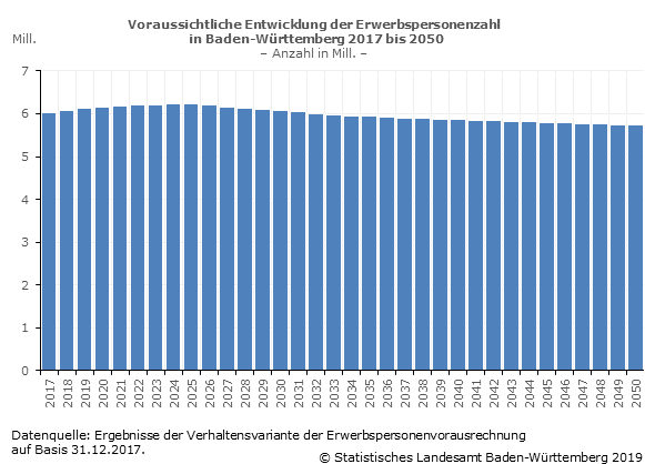 Die Zahl der Erwerbspersonen in Baden-Württemberg wird aller Voraussicht nach aufgrund der zuletzt stark gestiegenen Zuwanderung und einer zu erwartenden höheren Erwerbsbeteiligung erst mittelfristig zurückgehen (siehe methodische Erläuterungen). Konkret kommt eine aktuelle Vorausrechnung des Statistischen Landesamtes zu dem Ergebnis, dass die Erwerbspersonenzahl von rund 6,02 Mill. im Jahr 2017 noch bis 2025 um annähernd 200 000 auf 6,21 Mill. ansteigen und erst im Jahr 2032 unter das Niveau von 2017 absinken könnte. Im Jahr 2050 läge aber die Erwerbspersonenzahl um etwa 300 000 oder um 5 % niedriger als 2017, dem Ausgangsjahr der Vorausrechnung.