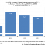 Der Anteil der Erwerbspersonen an der Gesamtbevölkerung lag im Jahr 2017 in Baden-Württemberg bei knapp 55 %; dieser Anteil könnte sich in den kommenden Jahren aufgrund des vermuteten Anstiegs der Erwerbsbeteiligung vergrößern, so dass die Lasten der sozialen Sicherungssysteme in den nächsten Jahren rechnerisch sogar auf mehr Schultern verteilt werden könnten. Ab dem Jahr 2023 würde der Anteil der Erwerbspersonen an der Gesamtbevölkerung stetig bis 2050 auf rund 51 % zurückgehen.