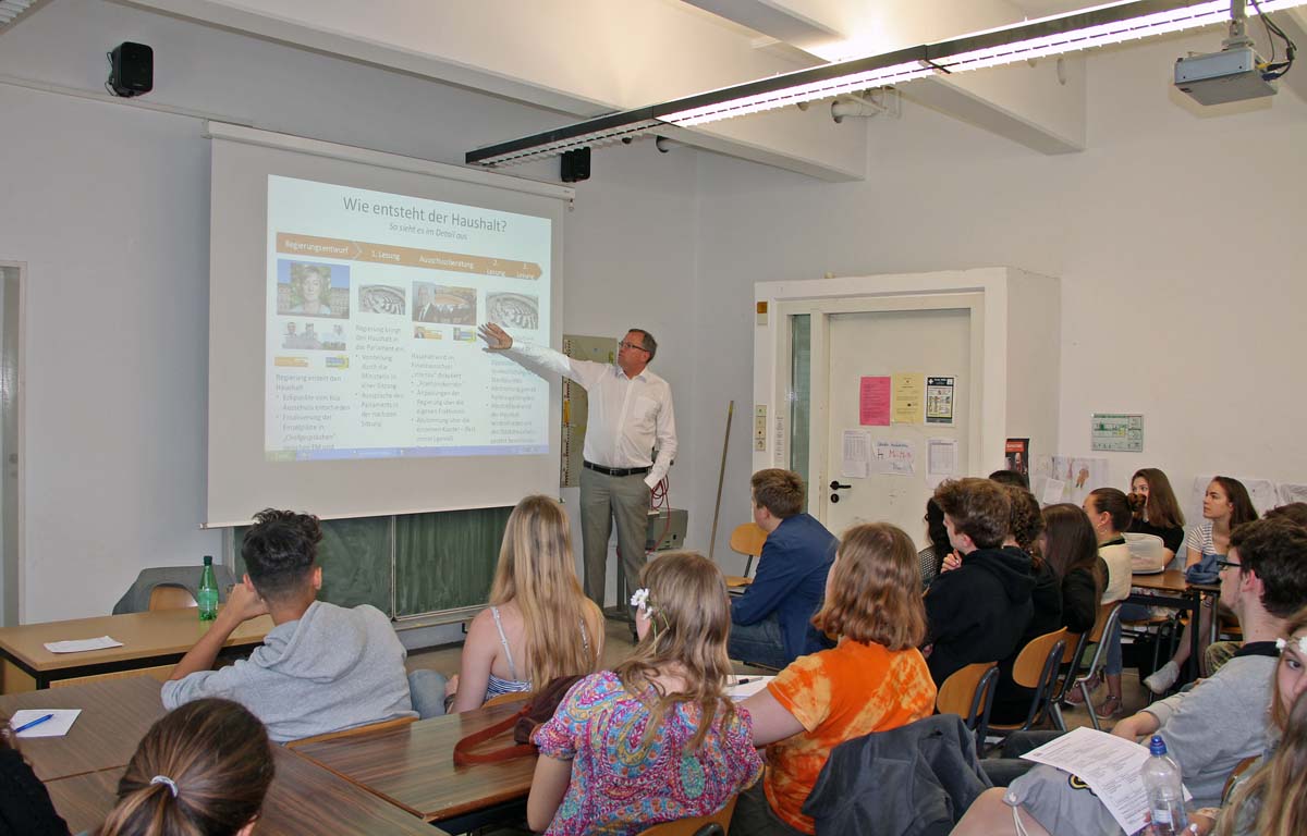 Schütte, der für die CDU-Landtagsfraktion den Wahlkreis Heidelberg mitbetreut, sprach mit rund vierzig interessierten Schülerinnen und Schülern aus den Politik- und Wirtschaftskursen der Sekundarstufe II. In seiner Einführung berichtete der ehemalige Hölderliner anschaulich aus dem Alltag eines Abgeordneten. Zudem ermöglichte er einen Blick hinter die Kulissen, beispielsweise bei den Haushaltsberatungen. Klar machte er, dass viele der Vorteile einer offenen Gesellschaft wie Meinungsfreiheit oder unabhängige Gerichte inzwischen zu häufig als Selbstverständlichkeit gesehen werde. Für ihn stünden neben ausreichender Innerer Sicherheit, einer Stärkung der Kommunen, der Sanierung der Infrastruktur vor allem Bildung und Forschung im Mittelpunkt. „Wir müssen auch in Abwägung mit anderen gut begründeten Wünschen dafür sorgen, dass ausreichend Mittel und Personal zur Verfügung stehen. Zudem müssen die Mittel dann auch sinnvoll eingesetzt werden.“ Er sei froh, dass Qualität der Schulbildung wieder im Fokus der Politik stünde.