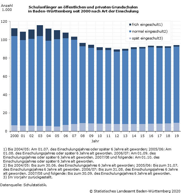 Die Zahl der Einschulungen an Grundschulen ging im Zeitraum von 2000 bis 2019 um knapp ein Sechstel von rund 112 650 auf gut 94 020 zurück. Die Zahl der Einschulungen 2019 war leicht höher als im Vorjahr (+1,5 %). Die rund 94 020 Schulanfängerinnen und -anfänger an den Grundschulen im letzten Jahr (Herbst 2019) setzten sich zusammen aus knapp 83 110 »normal« eingeschulten Kindern (bis zum 30.09.2019 sechs Jahre alt geworden), rund 1 610 »früh« eingeschulten Kindern (nach dem 30.09.2019 sechs Jahre alt geworden) und gut 9 300 »spät« eingeschulten Kindern, die im Vorjahr zurückgestellt worden waren. Dies entspricht Anteilen von 1,7 % »früh«, 88,4 % »normal« und 9,9 % »spät« Eingeschulten.