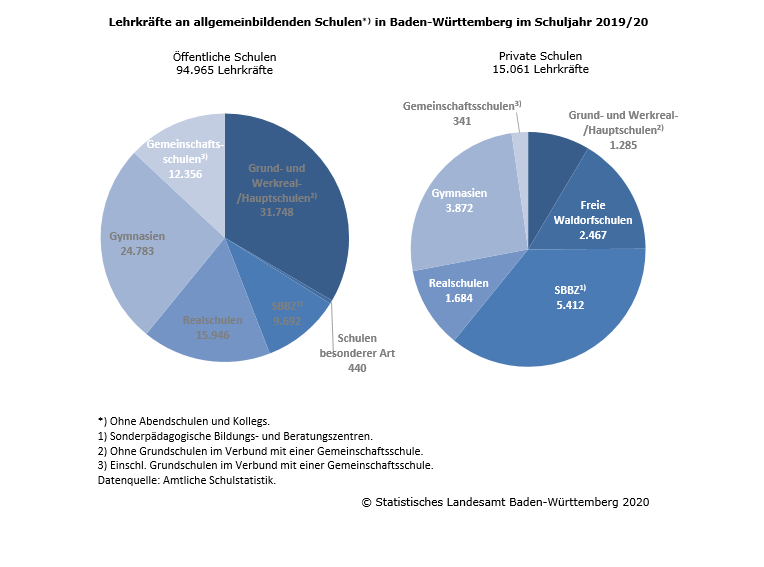 Der Großteil der Lehrerschaft an öffentlichen allgemeinbildenden Schulen unterrichtete mit 31 748 Personen an Grund- und Werkreal-/Hauptschulen (33,4 %) und mit 24 783 Personen an Gymnasien (26,1 %). An den privaten allgemeinbildenden Schulen dagegen lehrten die meisten Lehrkräfte an SBBZ (5 412 Personen oder 35,9 %) und an Gymnasien (3 872 Personen oder 25,7 %). Dabei ist anzumerken, dass nach den Freien Waldorfschulen, die nur privat geführt werden, bei der Schulart SBBZ der Anteil der Lehrkräfte aus privaten Schulen mit 35,8 % entsprechend ihrem Anteil an der Schülerzahl relativ hoch ist. Bei den anderen Schularten spielen die privaten Schulen, was die Anzahl der Lehrkräfte angeht, eher eine ergänzende Rolle zum öffentlichen Angebot.