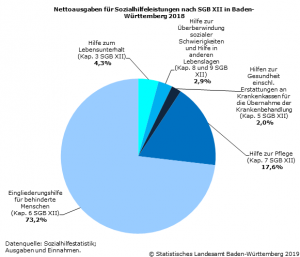 Für die Hilfe zum Lebensunterhalt (Kapitel 3 SGB XII) wurden netto 104,2 Mill. Euro ausgegeben und damit 3,9 % mehr als 2017. In die Hilfen zur Gesundheit (einschließlich Erstattungen an Krankenkassen für die Übernahme der Krankenbehandlung) nach Kapitel 5 SGB XII flossen netto 50,1 Mill. Euro (+5,4 %). Die Nettoausgaben für die Leistungen zur Eingliederung behinderter Menschen (Kapitel 6 SGB XII) schlugen mit 1,8 Mrd. Euro zu Buche (+6,2 %). Für Leistungen für Pflegebedürftige, die so genannte „Hilfe zur Pflege“ (Kapitel 7 SGB XII) wurden insgesamt 430 Mill. Euro ausgegeben (+5,8 %). Die Nettoausgaben für die Hilfe zur Überwindung besonderer sozialer Schwierigkeiten sowie die Hilfe in anderen Lebenslagen (Kapitel 8 und 9 SGB XII) lagen zusammen bei 71,8 Mill. Euro (+9,3 %).