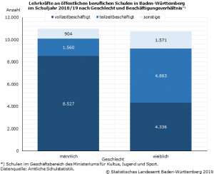 Im Schuljahr 2018/19 lag der Anteil weiblicher Lehrkräfte an öffentlichen beruflichen Schulen bei gut 49 %. Damit war die Geschlechterverteilung dieser Schulart annähernd gleichmäßig. Von diesen 10 770 Lehrerinnen waren etwas mehr als 40 % vollzeitbeschäftigt, gut 45 % teilzeitbeschäftigt und rund 15 % als sonstige Lehrkräfte tätig. Von ihren 10 991 männlichen Kollegen waren rund 78 % in Vollzeit- und gut ein Fünftel in Teilzeit- und sonstigen Arbeitsverhältnissen. An privaten beruflichen Schulen lag die Geschlechteraufteilung von weiblichen und männlichen Lehrkräften etwa bei 54 % : 46 %. Bei den Männern war der Anteil sonstiger Beschäftigter mit knapp 47 % am stärksten ausgeprägt. Etwa 24 % hatten eine Teilzeitstelle und gut 29 % arbeiteten mit vollem Deputat. Der Anteil vollzeitbeschäftigter Lehrerinnen lag bei rund 23 %. In Teilzeit arbeiteten etwas mehr als 39 % aller weiblichen Lehrkräfte und knapp 38 % waren als sonstige Beschäftigte tätig.