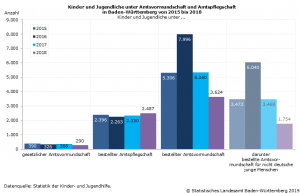 Beim Tod beider Eltern, aber auch bei einem vollständigen Entzug der elterlichen Sorge, einer anonymen Geburt oder bei der Einreise eines minderjährigen unbegleiteten Flüchtlings kann das Familiengericht das Jugendamt als Vormund einsetzen (bestellte Amtsvormundschaft). Dies betraf nach Feststellung des Statistischen Landesamtes im Jahr 2018 insgesamt 3 624 Kinder und Jugendliche in Baden-Württemberg, davon 1 145 Mädchen und 2 479 Jungen.1 Damit ist die Zahl der bestellten Amtsvormundschaften gegenüber 2017 (5 340) um 32 % gesunken. Dies ist insbesondere auf die rückläufige Zahl unbegleiteter minderjähriger Ausländerinnen und Ausländer zurückzuführen. Die Zahl der bestellten Amtsvormundschaften für junge Menschen mit ausländischer Nationalität hat sich mit 1 754 im Vergleich zum Vorjahr (3 468) fast halbiert.